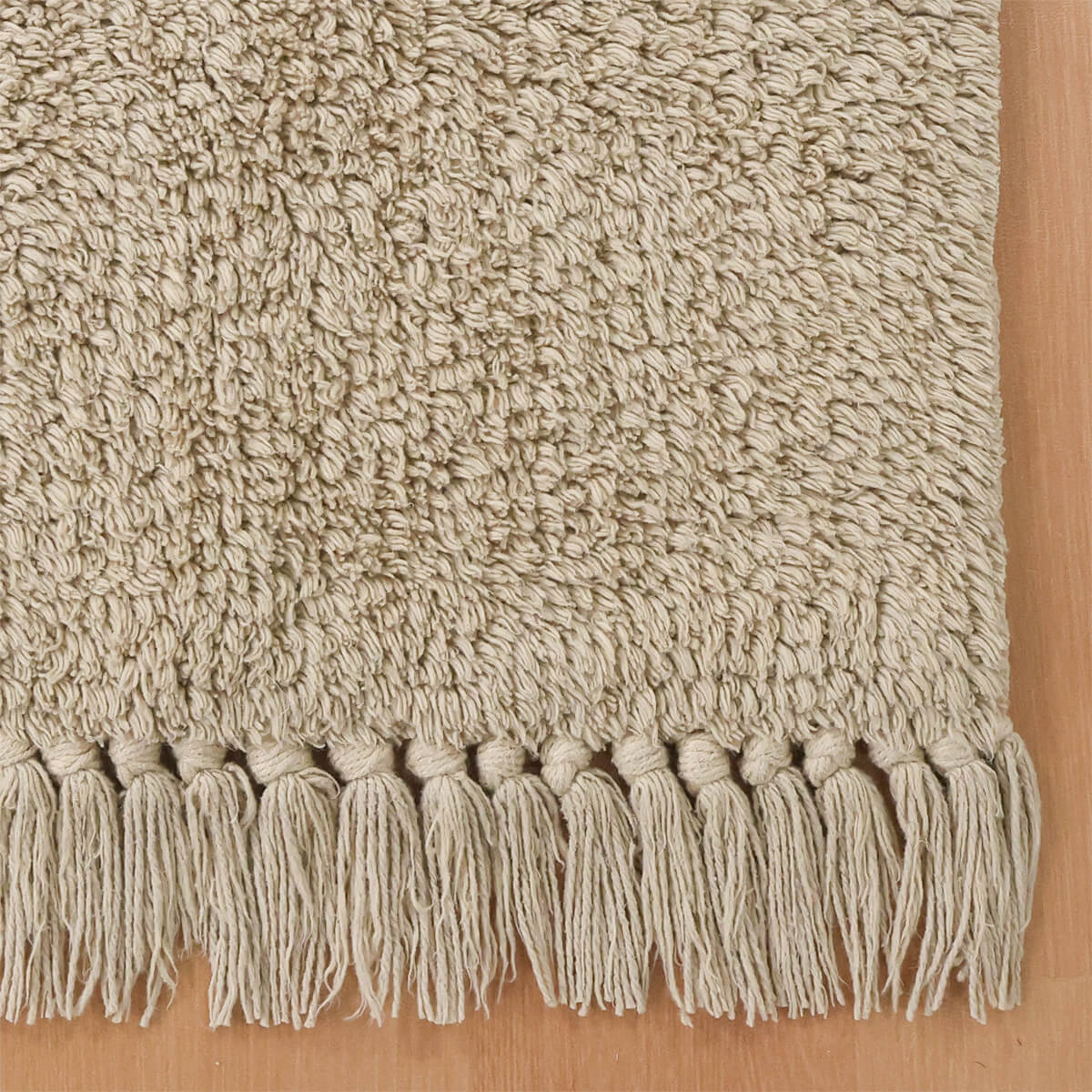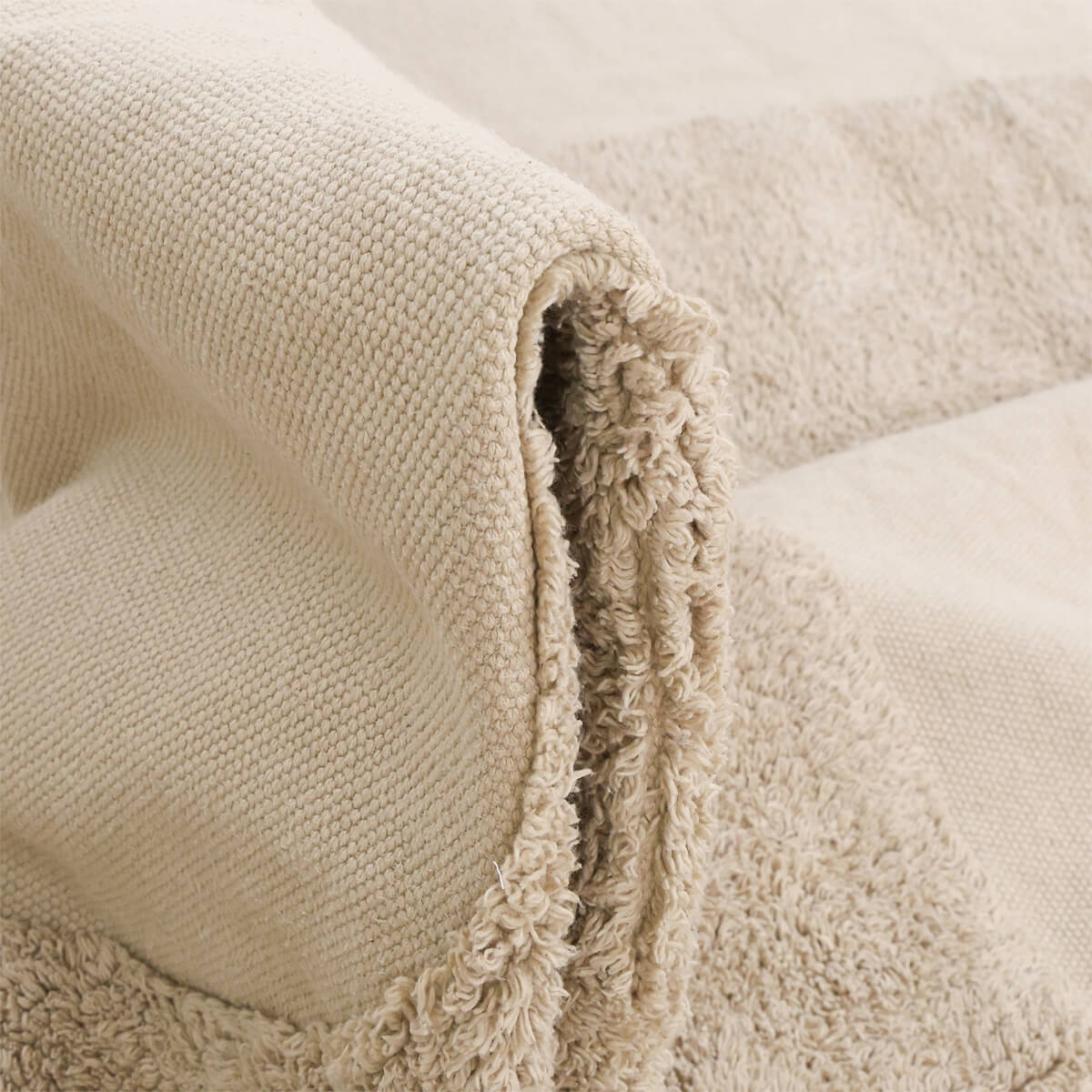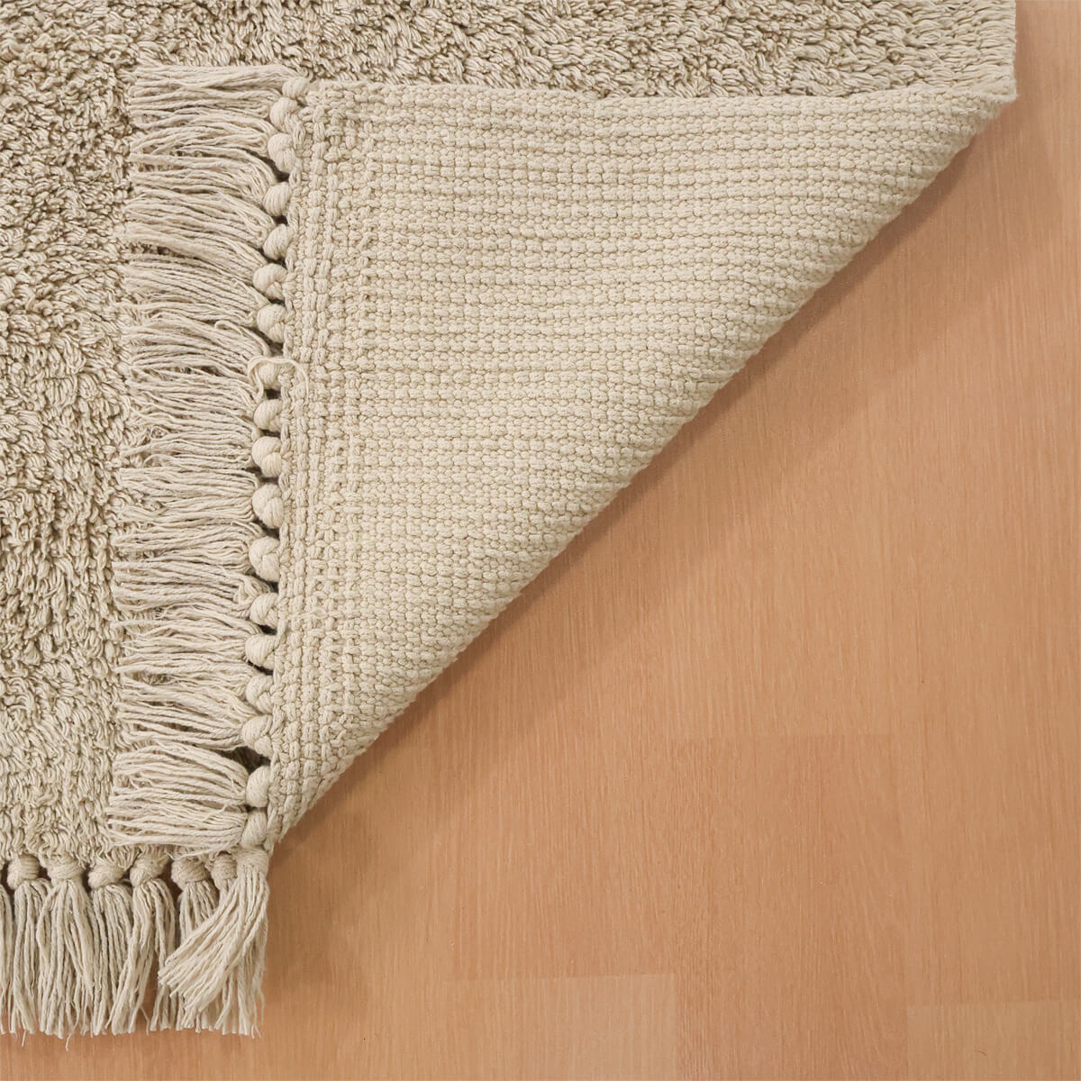 שטיח בעל טקסטורה תלת מימדית, פרוותית ונעימה. מעוצב בצבעוניות ניטרלית בצבע בז' המשווה לו מראה אלגנטי ועדין. נארג מ-100% כותנה איכותית, רכה ונעימה למגע. ניתן לניקוי במכונת הכביסה