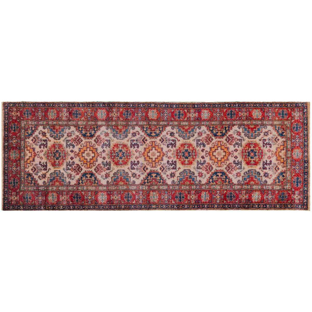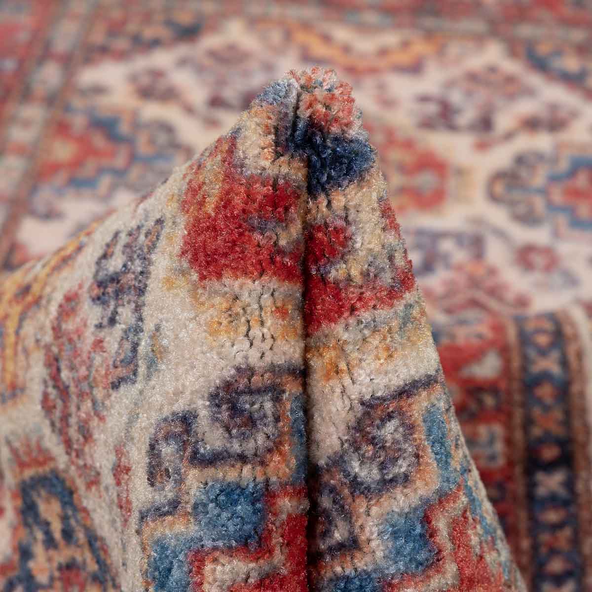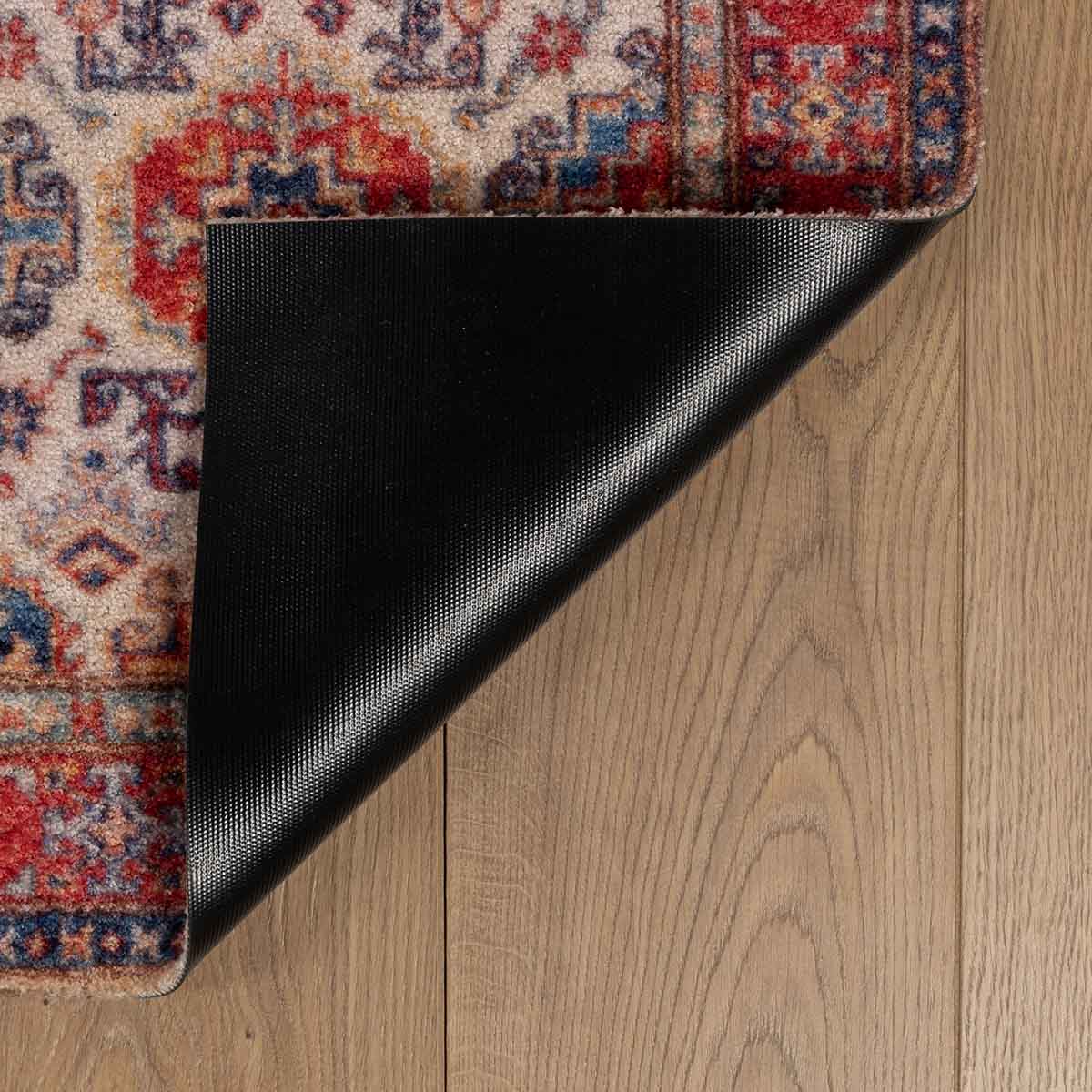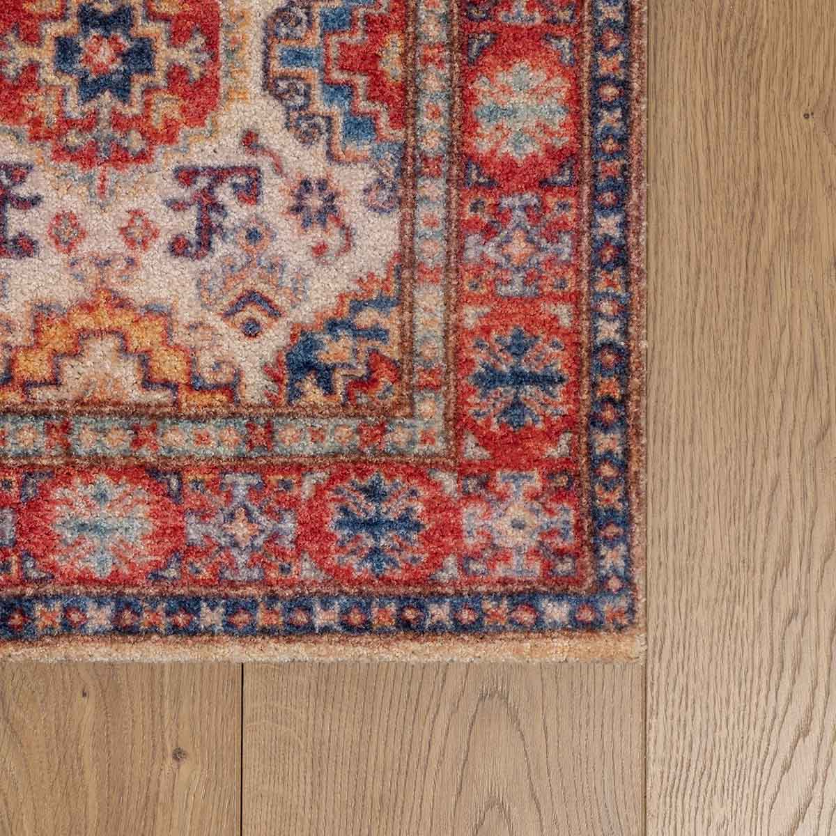 שטיח מטבח מעוטר בהשראת שטיחי אריאנה הפרסיים, בצבעוניות חמימה ועשירה של אדום, זהב וכחול.