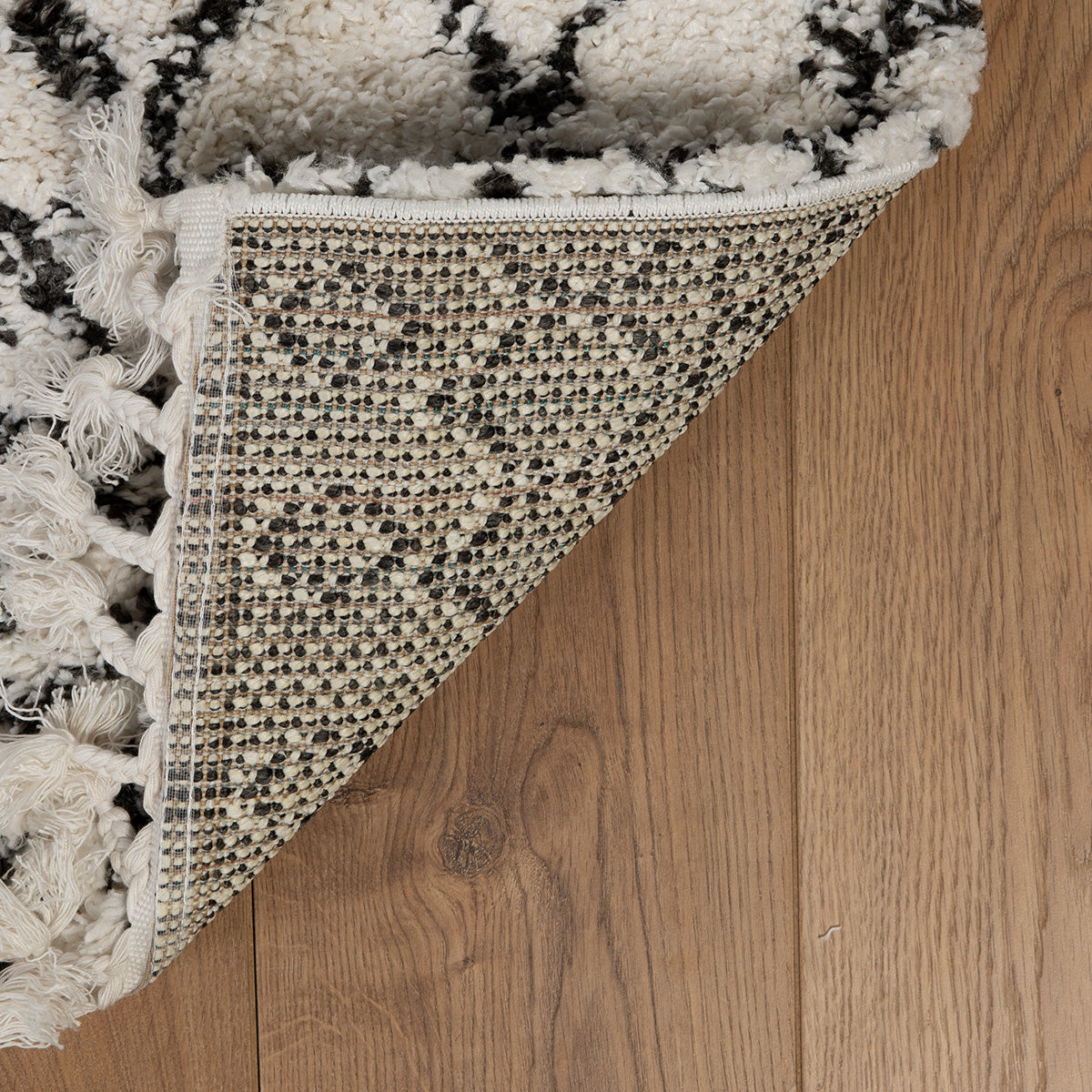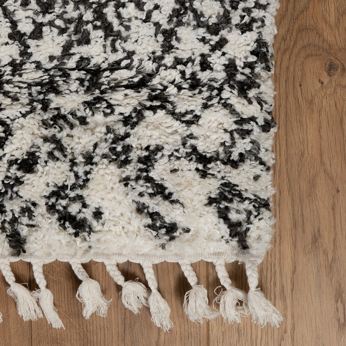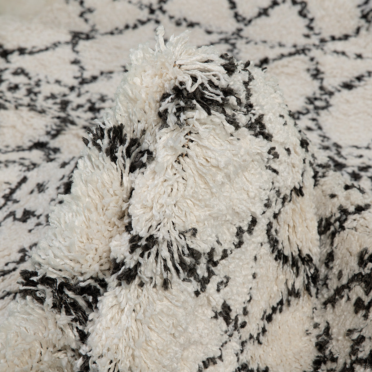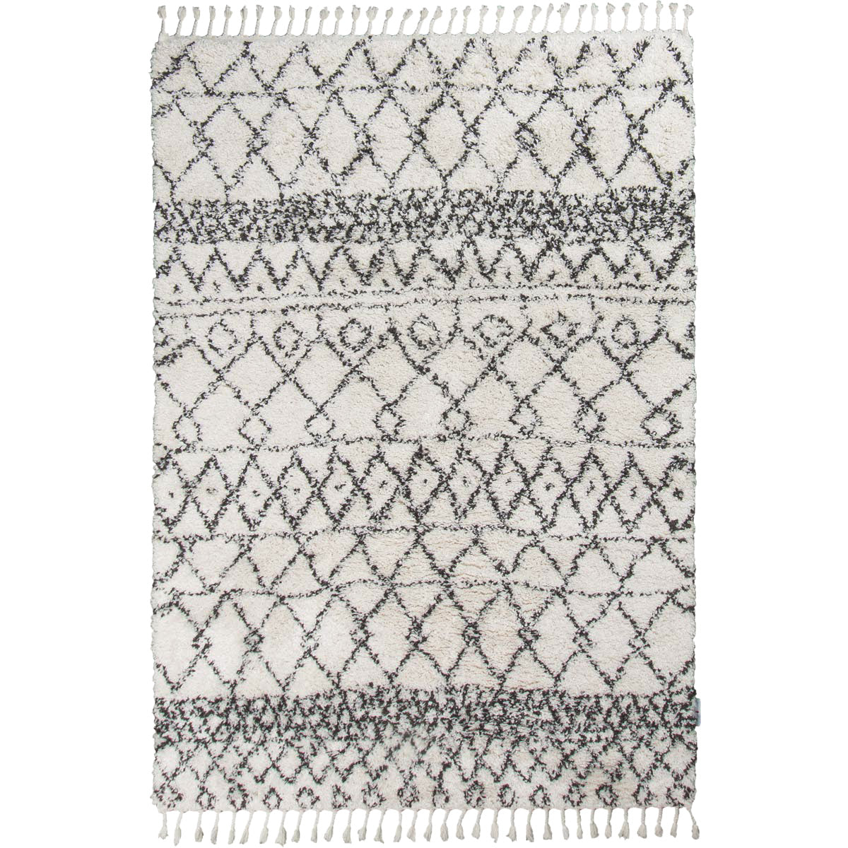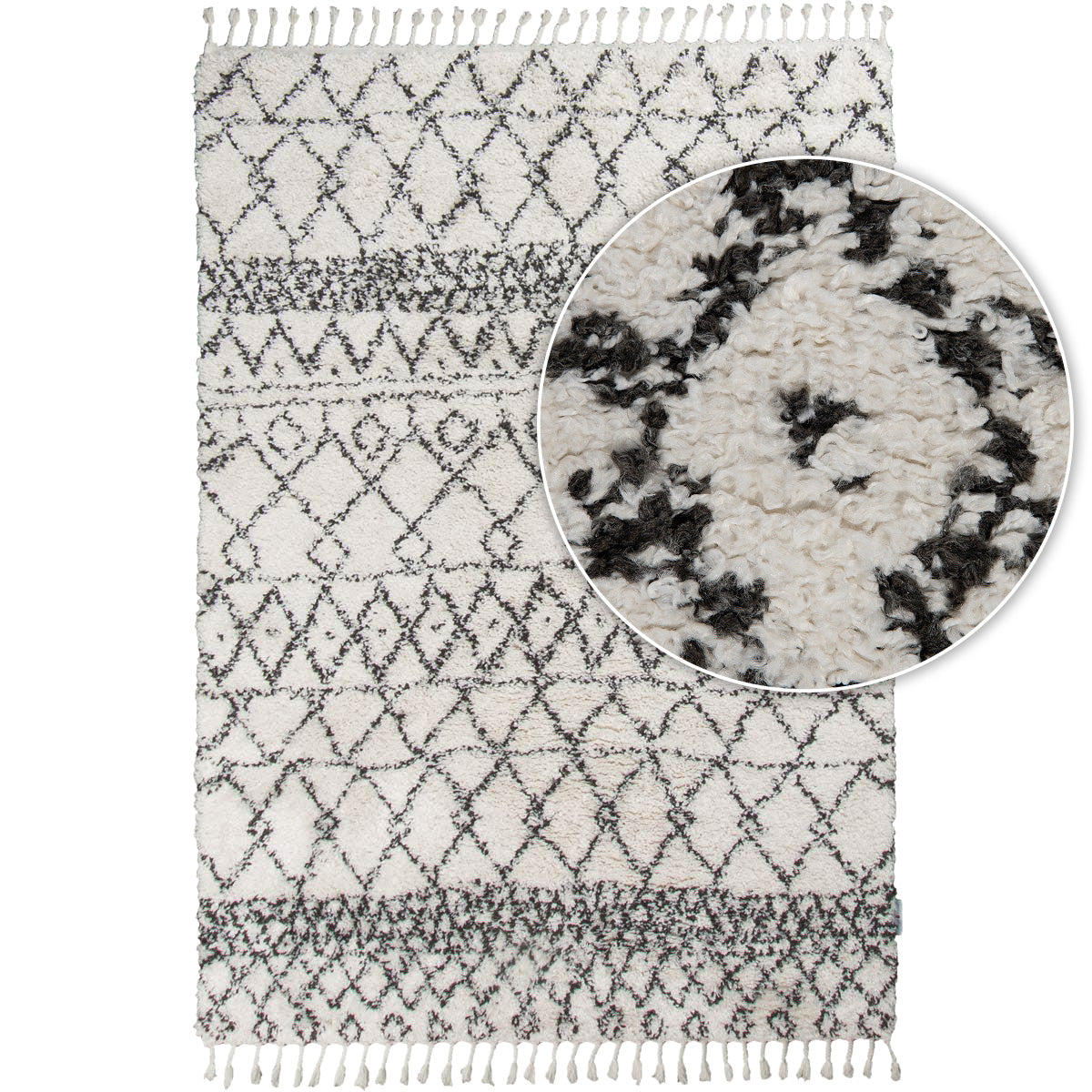 דוגמא אחת שווה אלף מילים. שטיח בסגנון מרוקאי, מעוטר בדוגמא גיאומטרית עשירה בסגנון אתני. בעל מרקם פרוותי רך ומלטף, ההופך אותו לבחירה נהדרת עבור חדר השינה וחדר הילדים, שם הוא יעטוף את החלל ברכות. מעוצב בצבעוניות מונוכרומטית של שחור – לבן קלאסיים. השטיח מעוטר בסיומת פרנזים שיקית