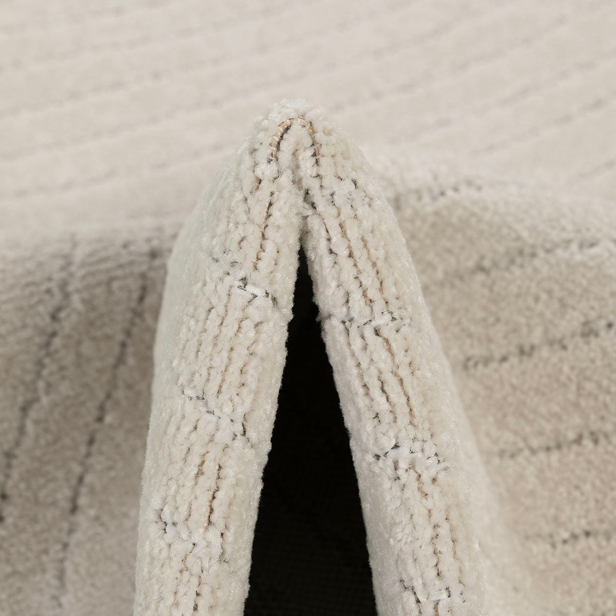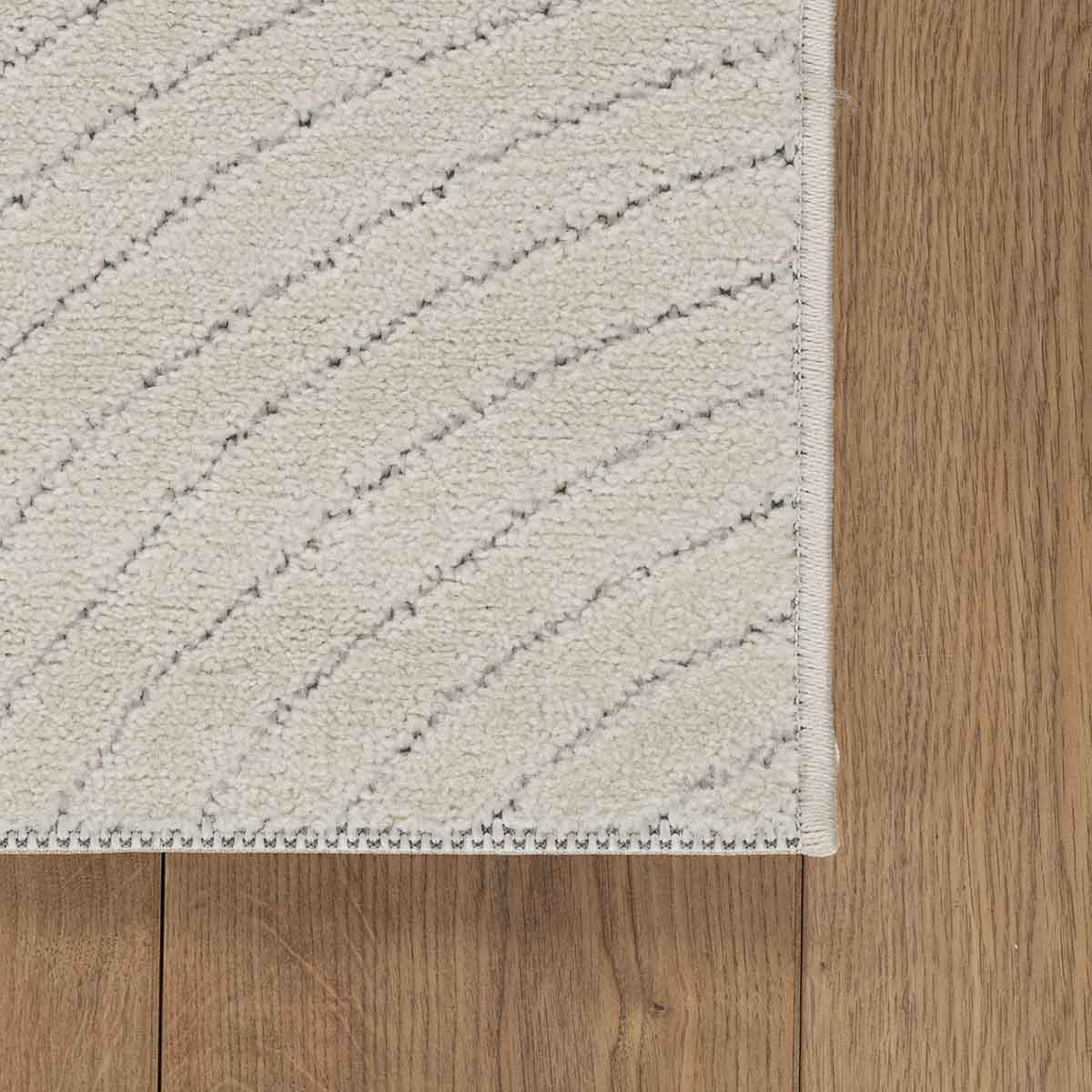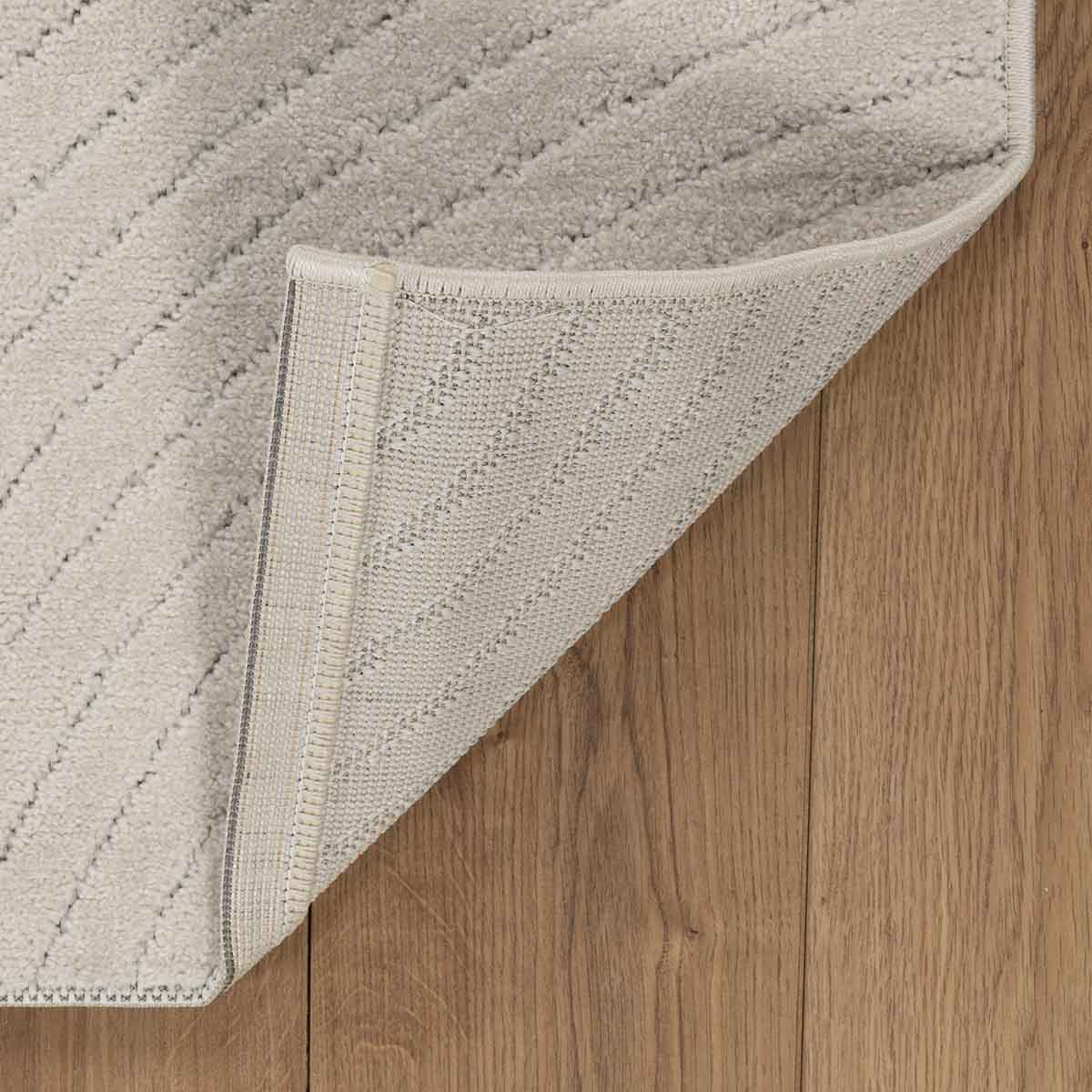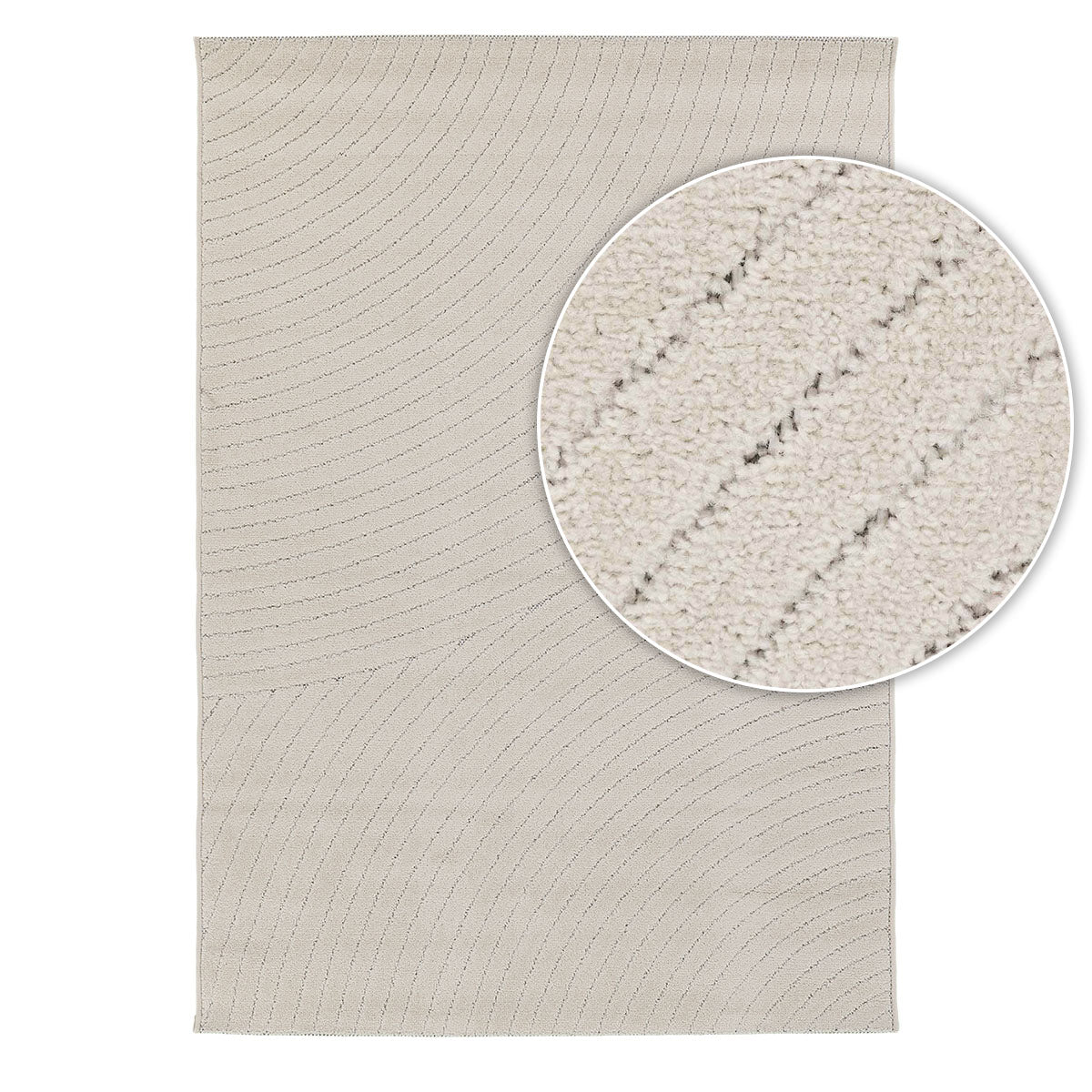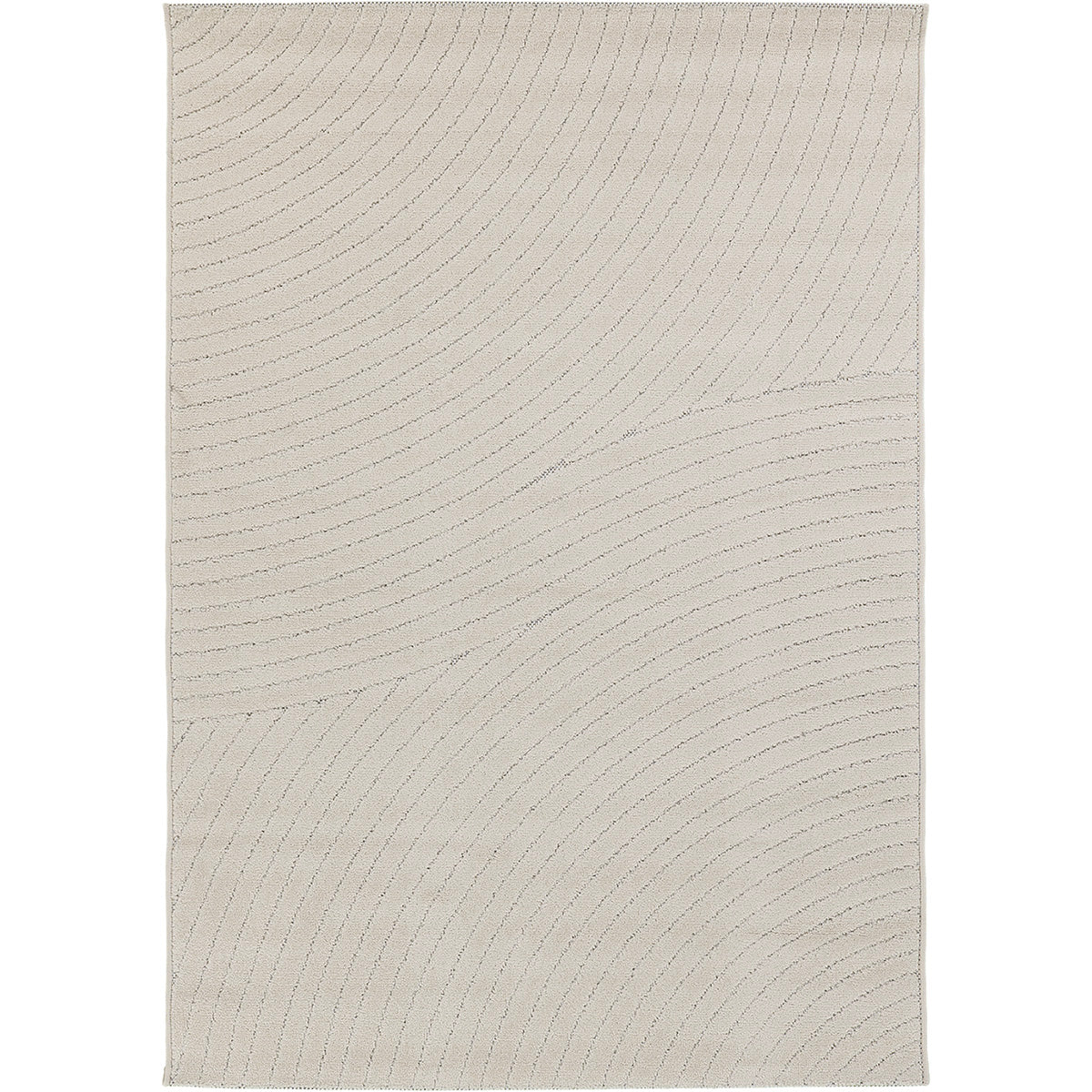 שטיח מודרני בגוון קרם רך, עשוי פוליפרופילן ופוליאסטר בעבודת מכונה איכותית. משלב טקסטורה של קווים מתעגלים בגבהים שונים, בהשראת תנועת קשתות, בצורה מרומזת וזורמת, ללא חזרתיות ברורה.