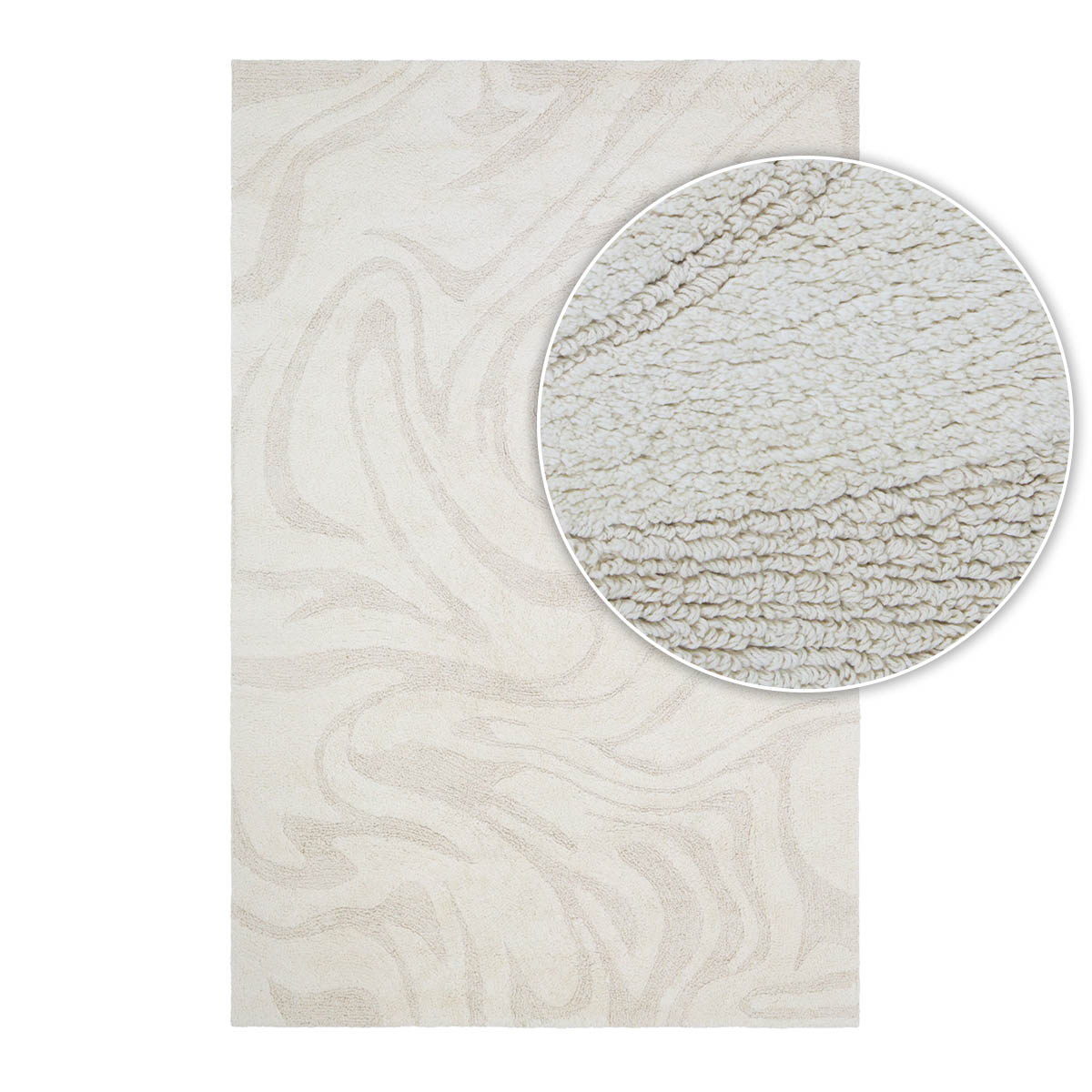 הוא נארג בטכניקה משולבת של לולאות (loops) ו־cut pile, שמייצרת משחק עדין של גבהים וטקסטורות – כמו תנועה רכה בתוך שכבת בד.