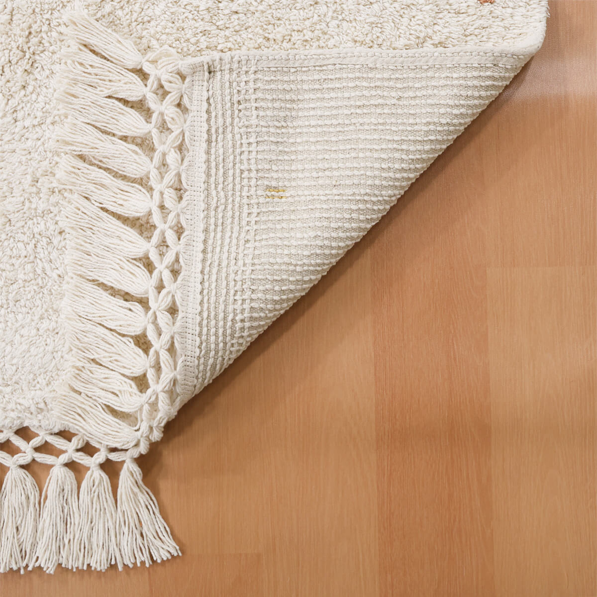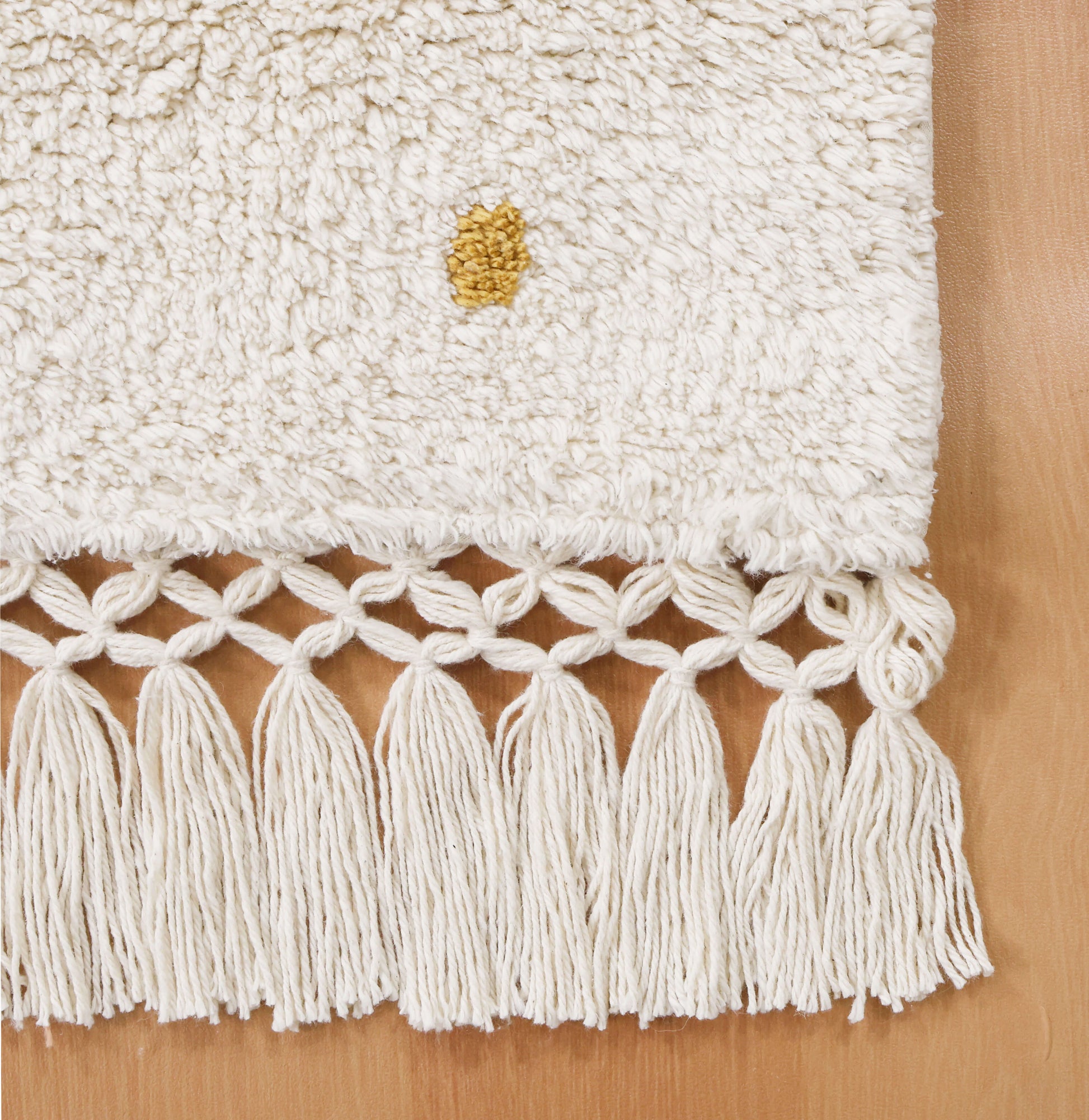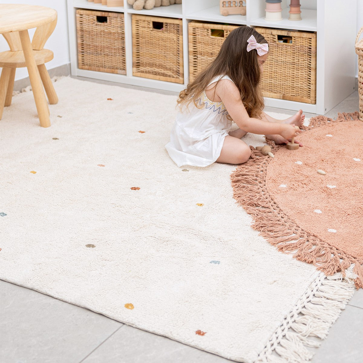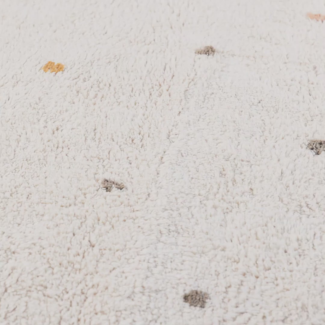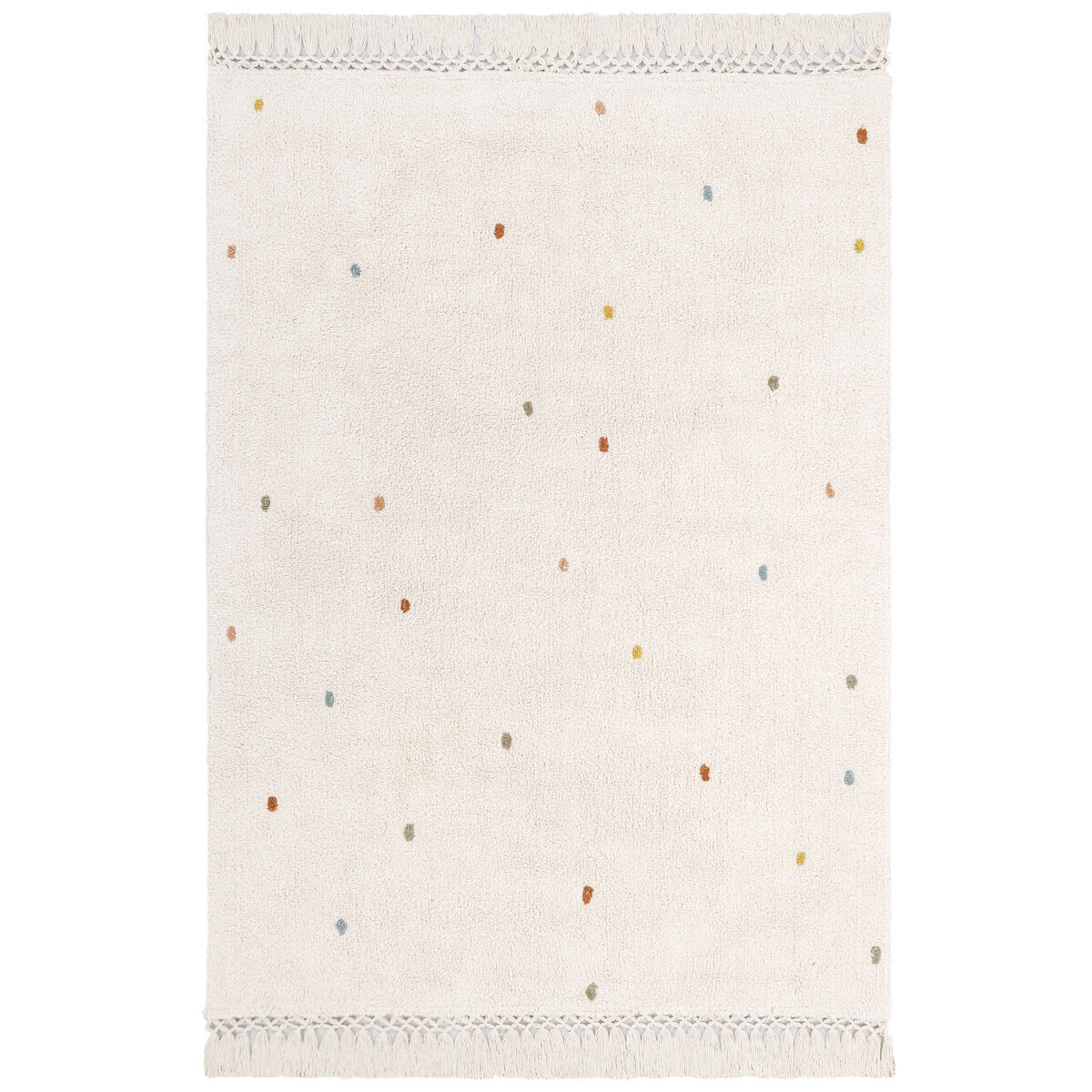 שטיח יפיפה כביס ומתאים לניקוי באמצעות מכונת הכביסה וכן לשטיפה ידנית במים וסבון. מהווה פתרון מושלם לבתים עם ילדים קטנים, בעלי חיים וכל מי שרוצה לשמור על ניקיון השטיח ללא מאמץ. מעוטר בדוגמת נקודות עדינה בצבעים עליזים, על רקע לבן קרם. השטיח מיוצר מ-100% כותנה רכה ונעימה, המאפשרת מגע במים.