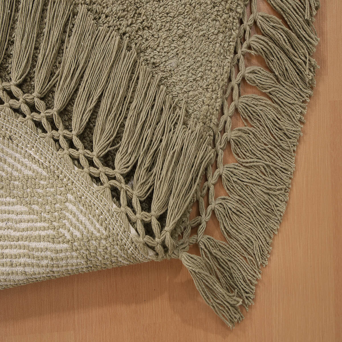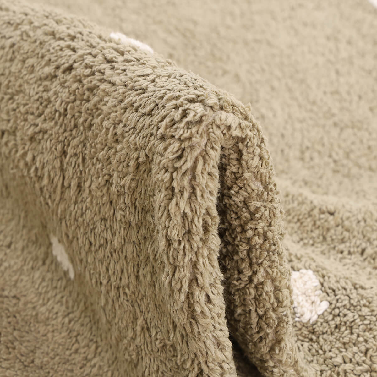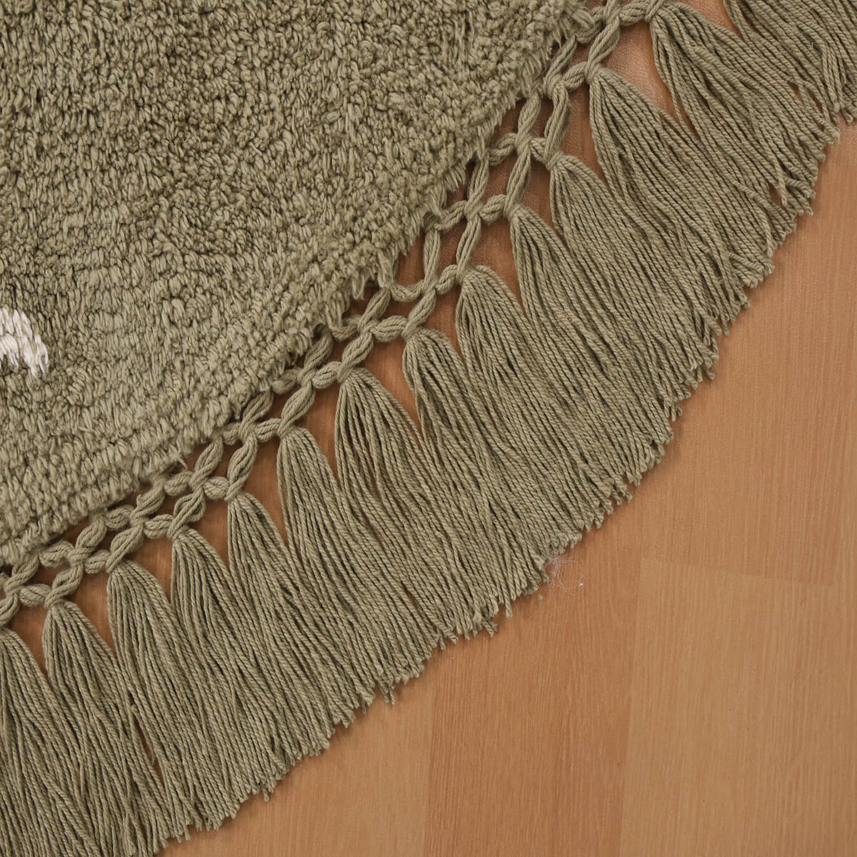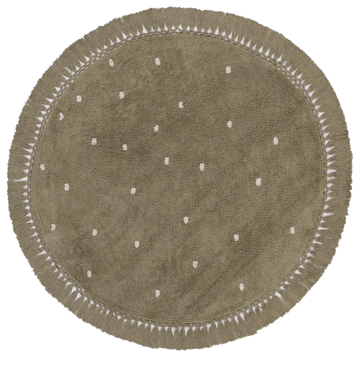 שטיח יפיפה כביס ומתאים לניקוי באמצעות מכונת הכביסה וכן לשטיפה ידנית במים וסבון. מהווה פתרון מושלם לבתים עם ילדים קטנים, בעלי חיים וכל מי שרוצה לשמור על ניקיון השטיח ללא מאמץ. מעוטר בדוגמת נקודות עדינה בגווני לבן, על רקע ירוק זית. צורתו העגולה תורמת לתחושת הזרימה בחלל.