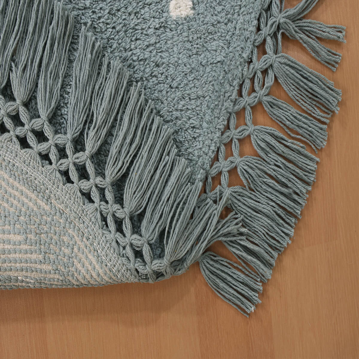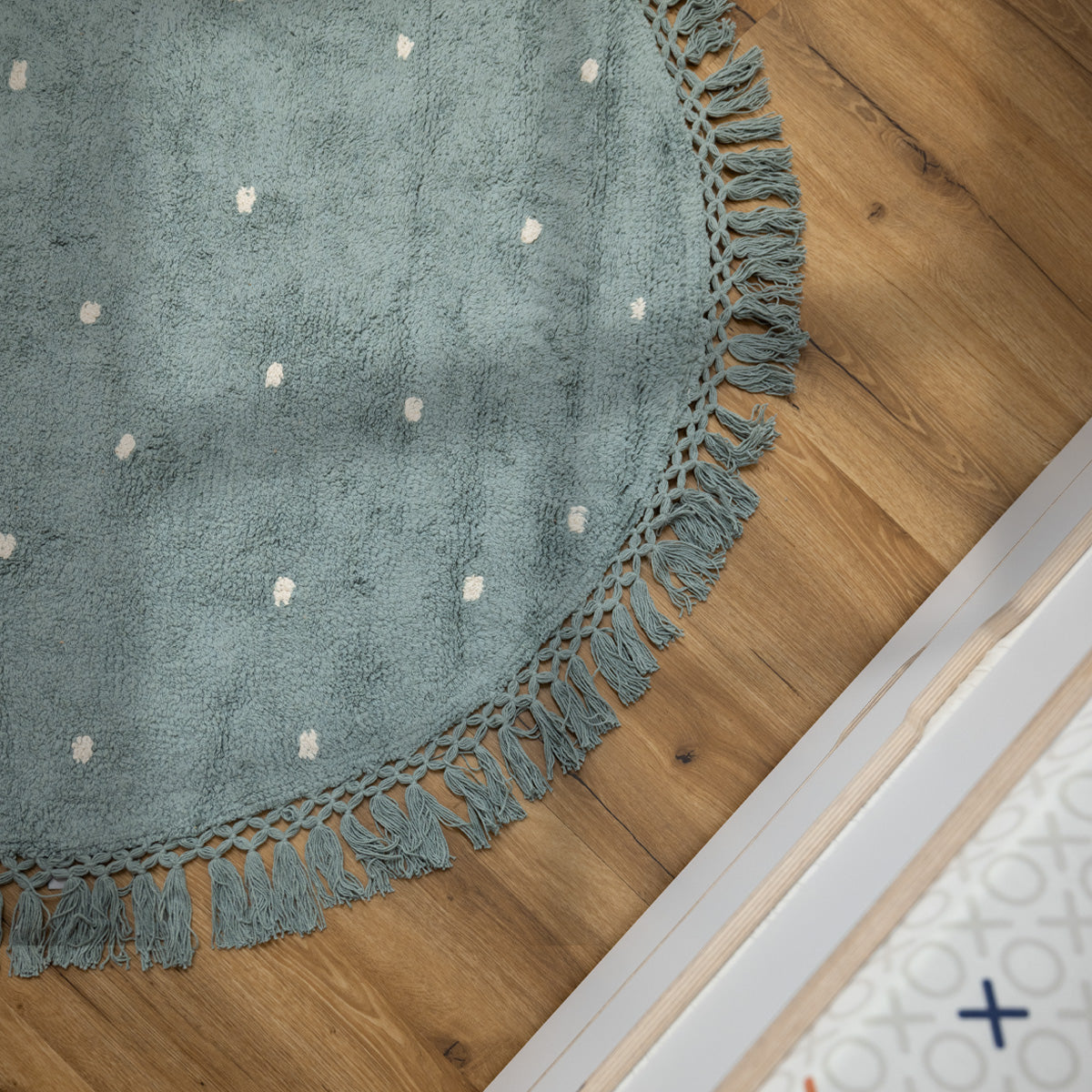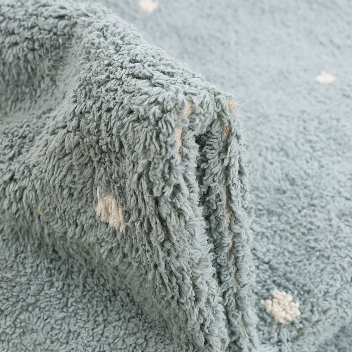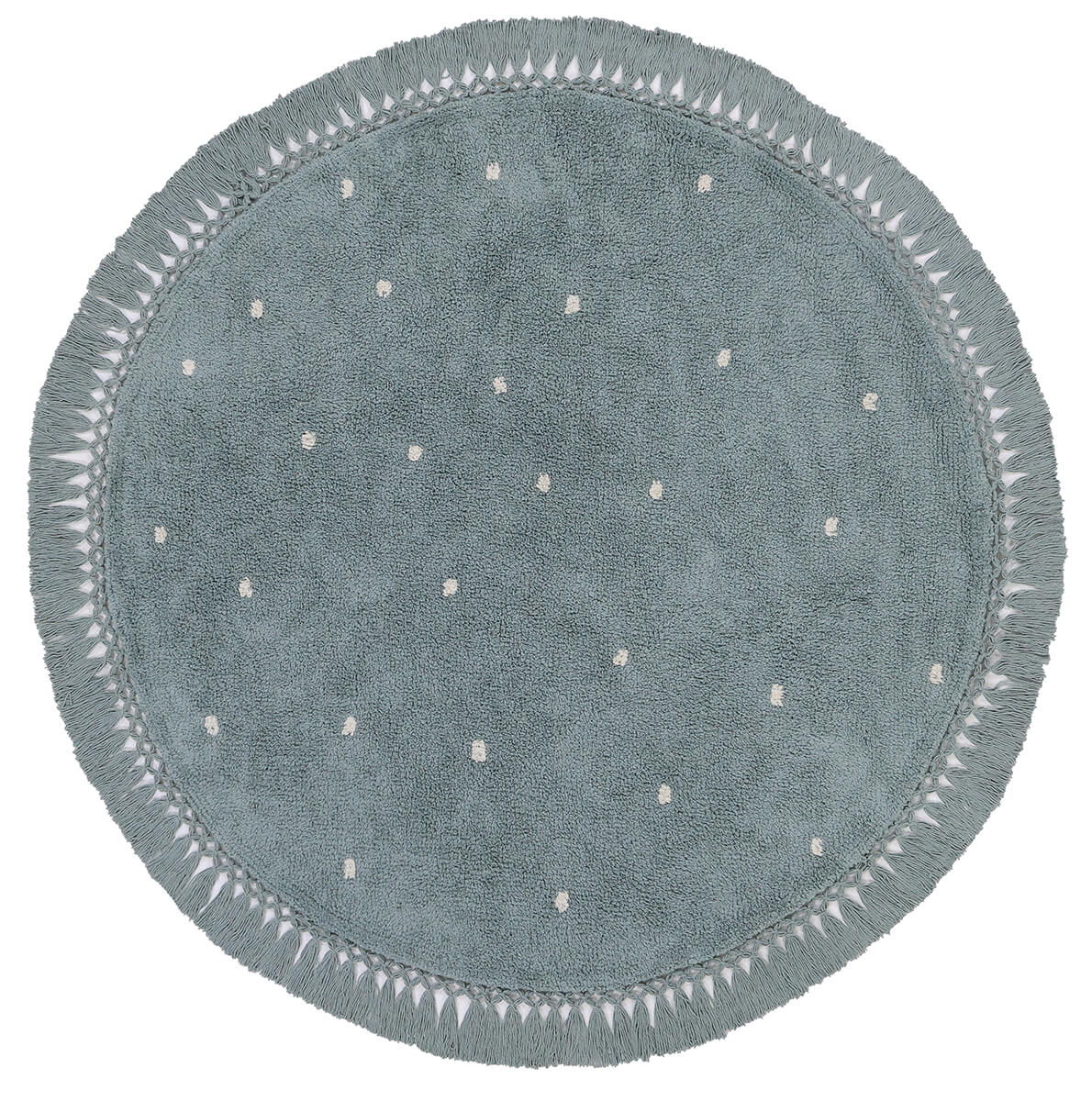 שטיח יפיפה כביס ומתאים לניקוי באמצעות מכונת הכביסה וכן לשטיפה ידנית במים וסבון. מהווה פתרון מושלם לבתים עם ילדים קטנים, בעלי חיים וכל מי שרוצה לשמור על ניקיון השטיח ללא מאמץ. מעוטר בדוגמת נקודות עדינה בגווני לבן, על רקע תכלת. צורתו העגולה תורמת לתחושת הזרימה בחלל