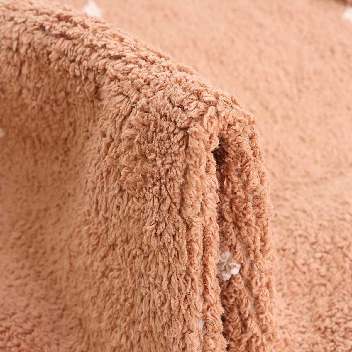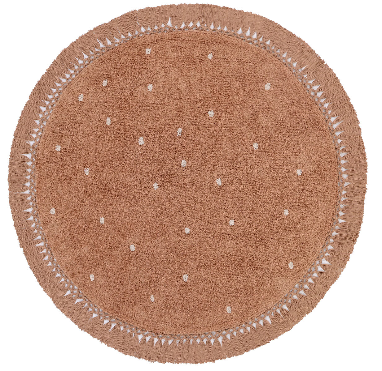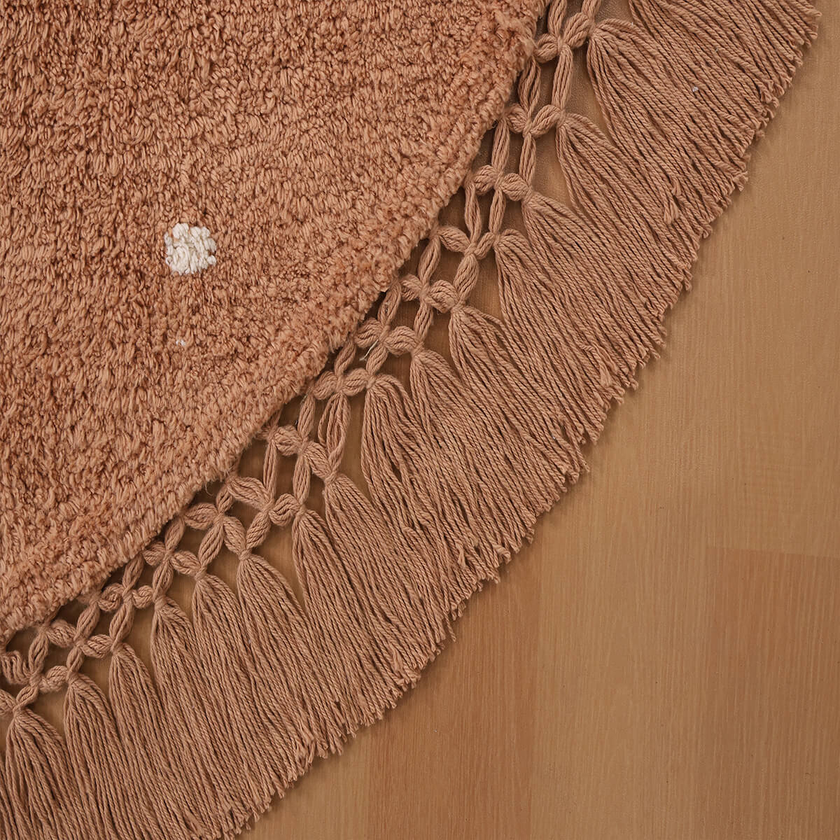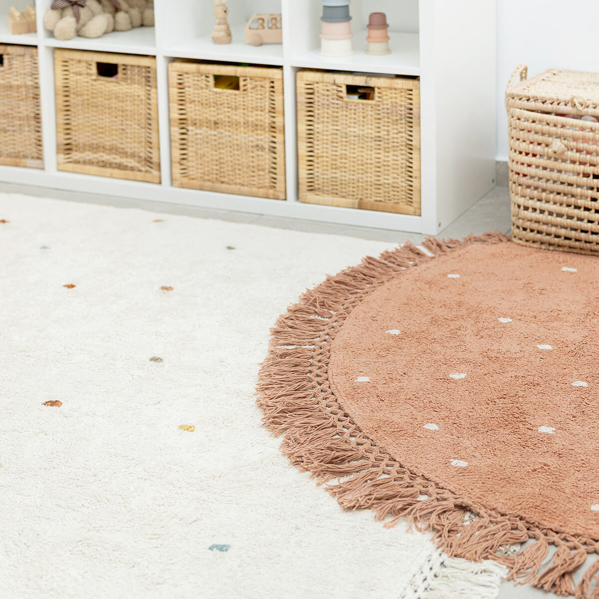 שטיח יפיפה כביס ומתאים לניקוי באמצעות מכונת הכביסה וכן לשטיפה ידנית במים וסבון. מהווה פתרון מושלם לבתים עם ילדים קטנים, בעלי חיים וכל מי שרוצה לשמור על ניקיון השטיח ללא מאמץ. מעוטר בדוגמת נקודות עדינה בגווני לבן, על רקע ורוד. צורתו העגולה תורמת לתחושת הזרימה בחלל