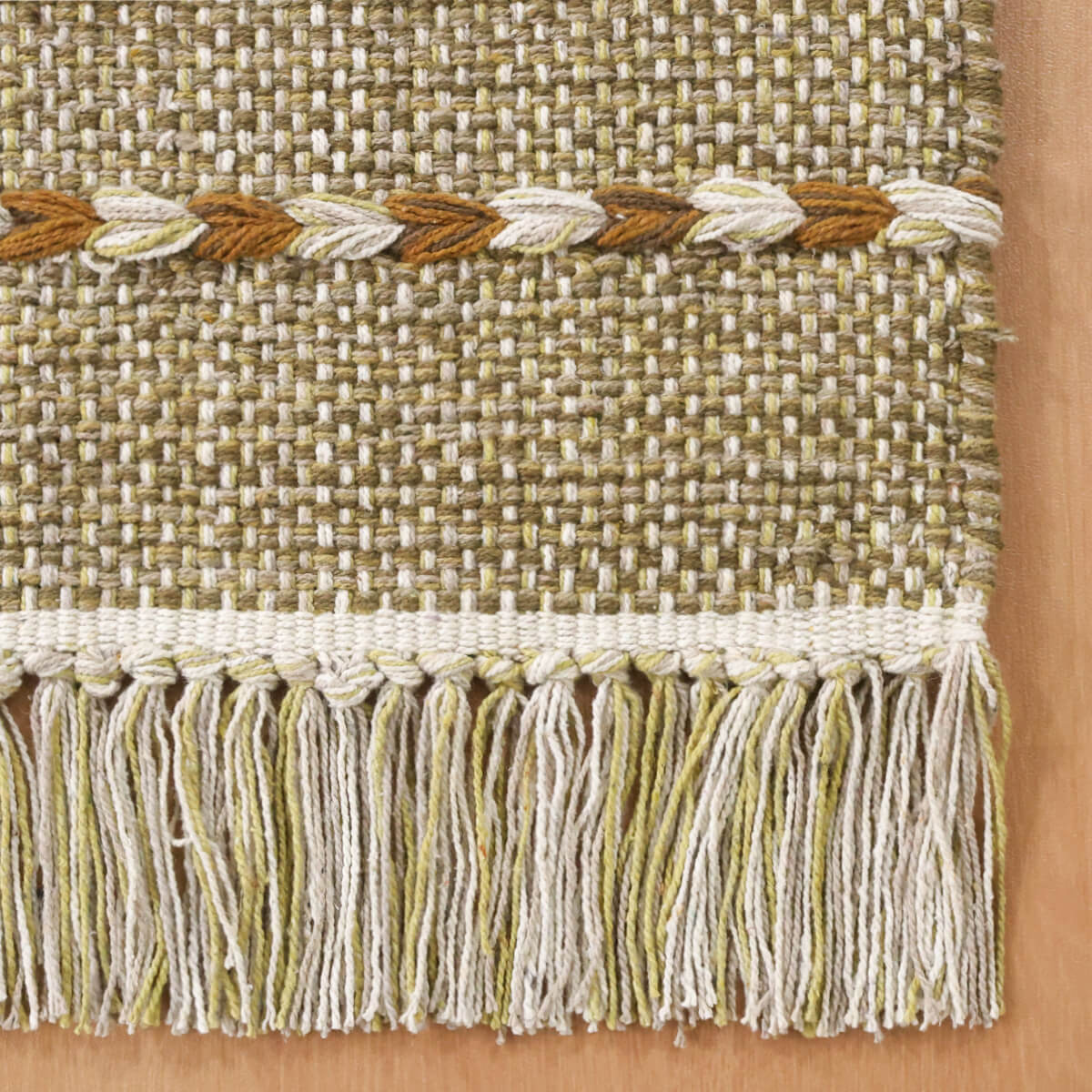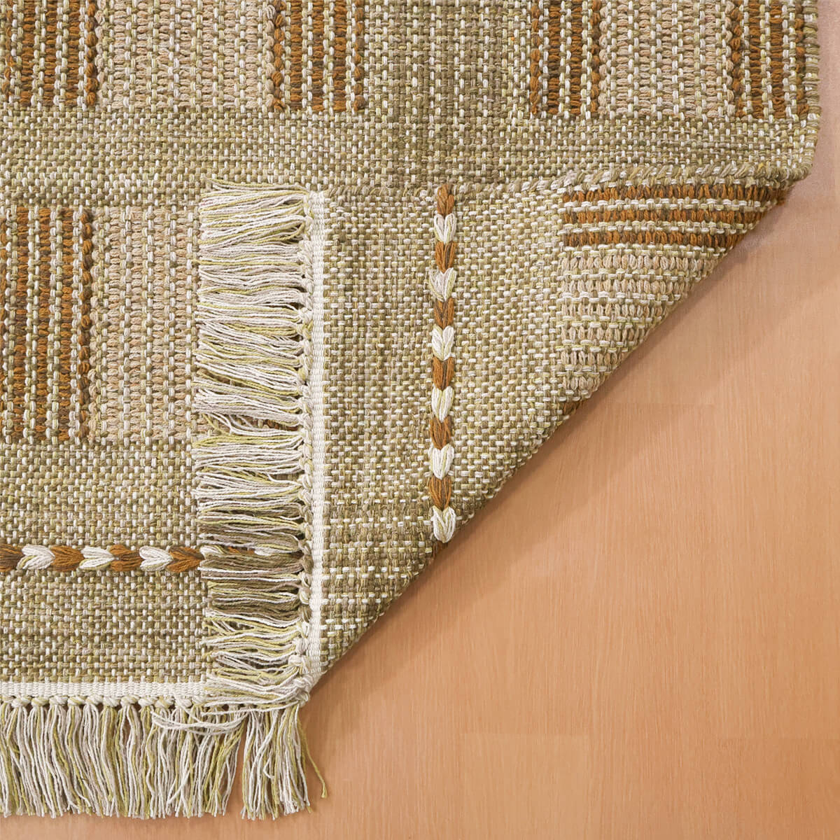 כל היופי של המראה הטבעי בשטיח אחד. שטיח טבעי הנארג בעבודת יד מוקפדת מ-100% כותנה איכותית, רכה ונעימה למגע. מעוצב בפלטת צבעים המשלבת גווני בז' וירוק עדינים, ומשלב דוגמת פסים ייחודית וסיומת פרנזים. השטיח ניתן לניקוי במכונת הכביסה.