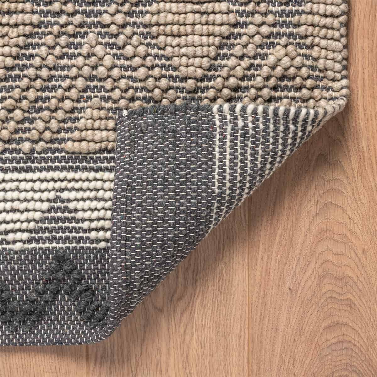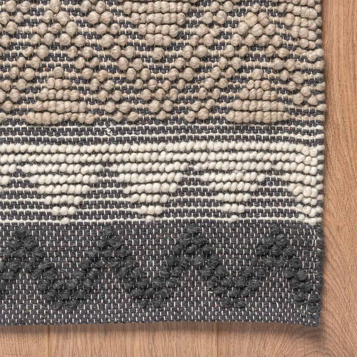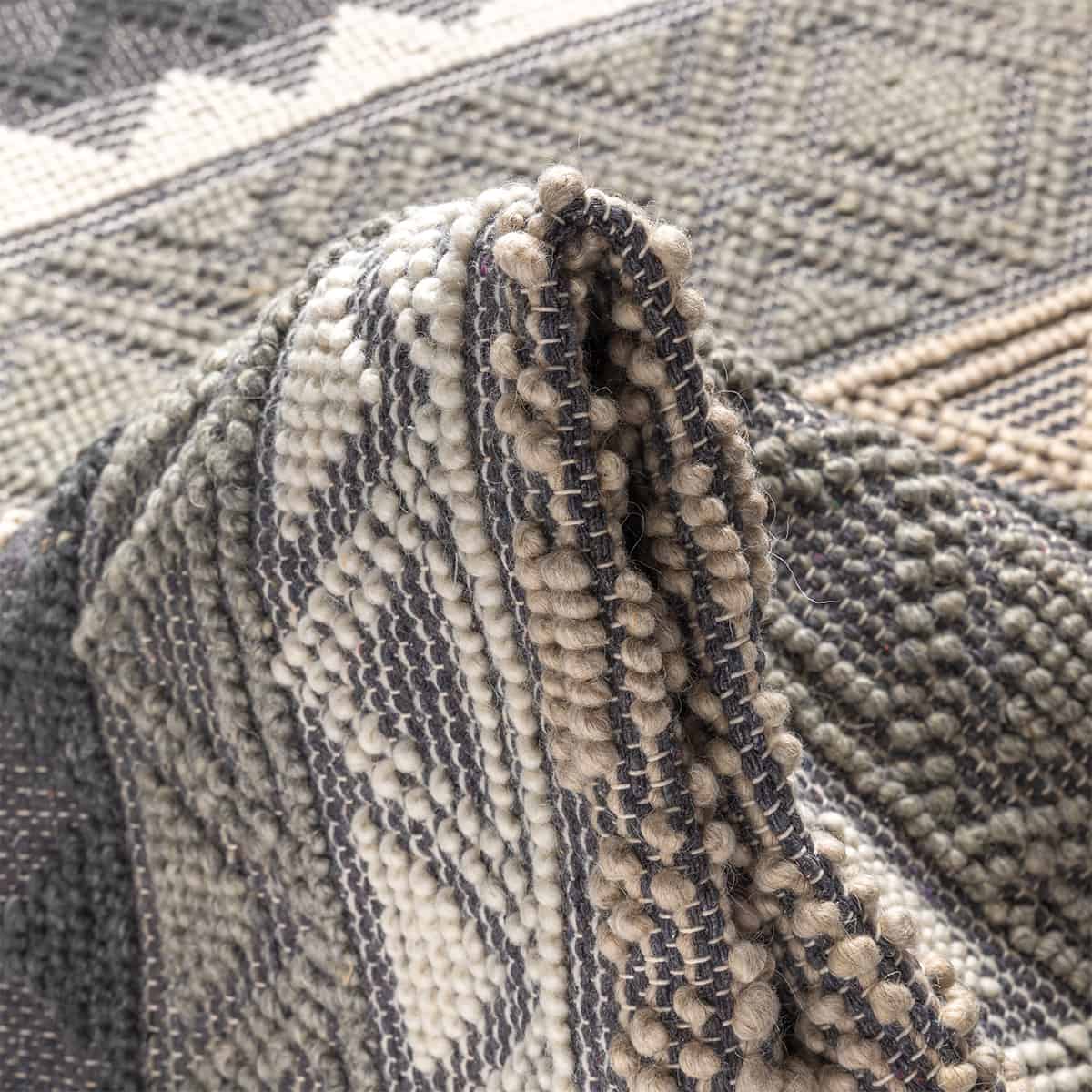 שטיח חבל יוקרתי הנארג נארג בעבודת יד מוקפדת. מעוטר בדוגמא מרהיבה המשלבת פסים אופקיים וצורות גיאומטריות לצד טקסטורה ייחודית. צבעוניות השטיח המודרנית מורכבת מגווני אפור ובז', אשר יתאימו לכל חלל ובמיוחד בחללים בסגנון סקנדינבי ובוהו – שיק