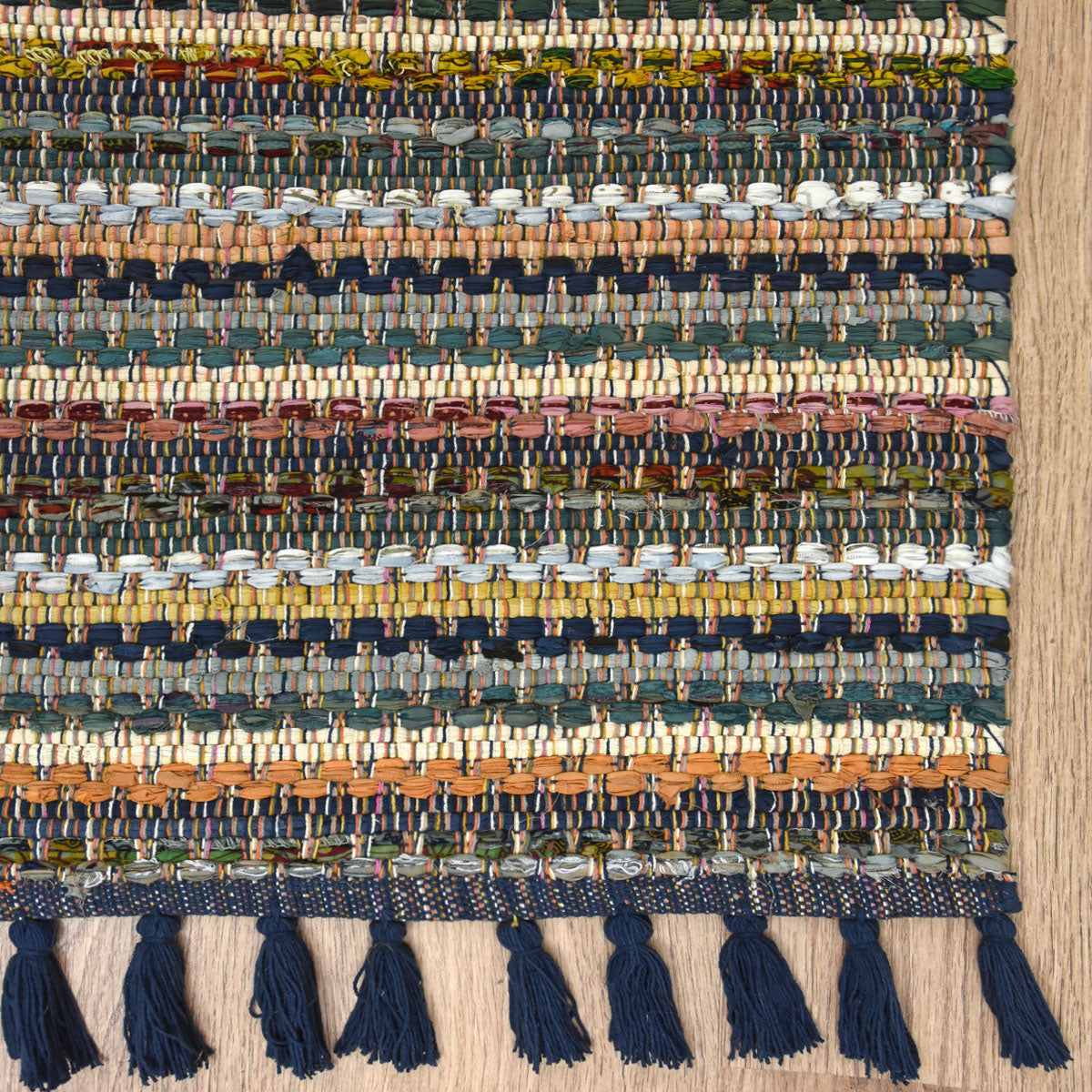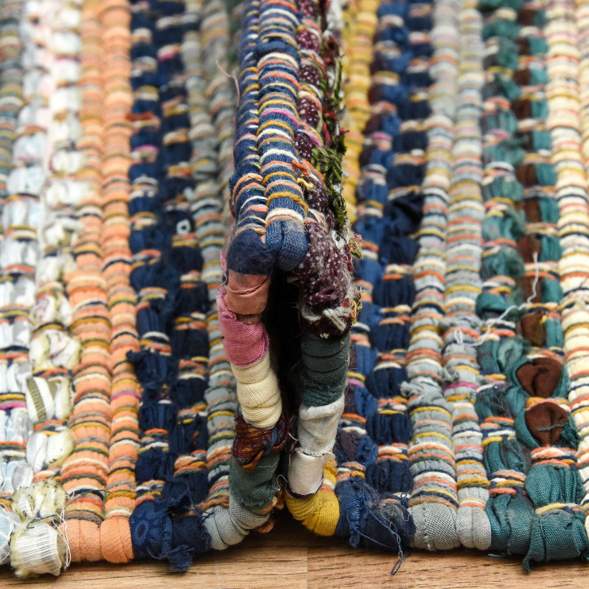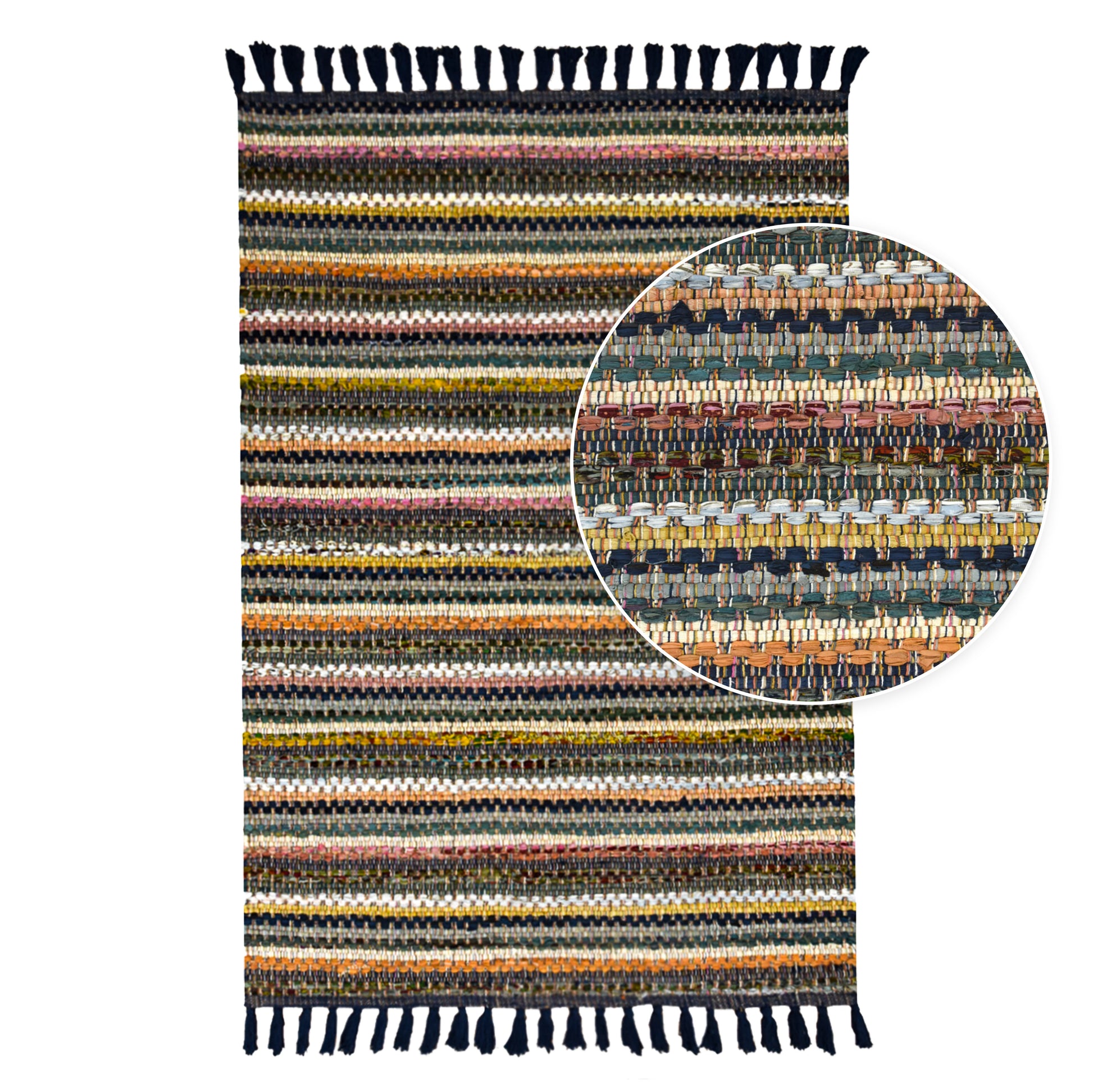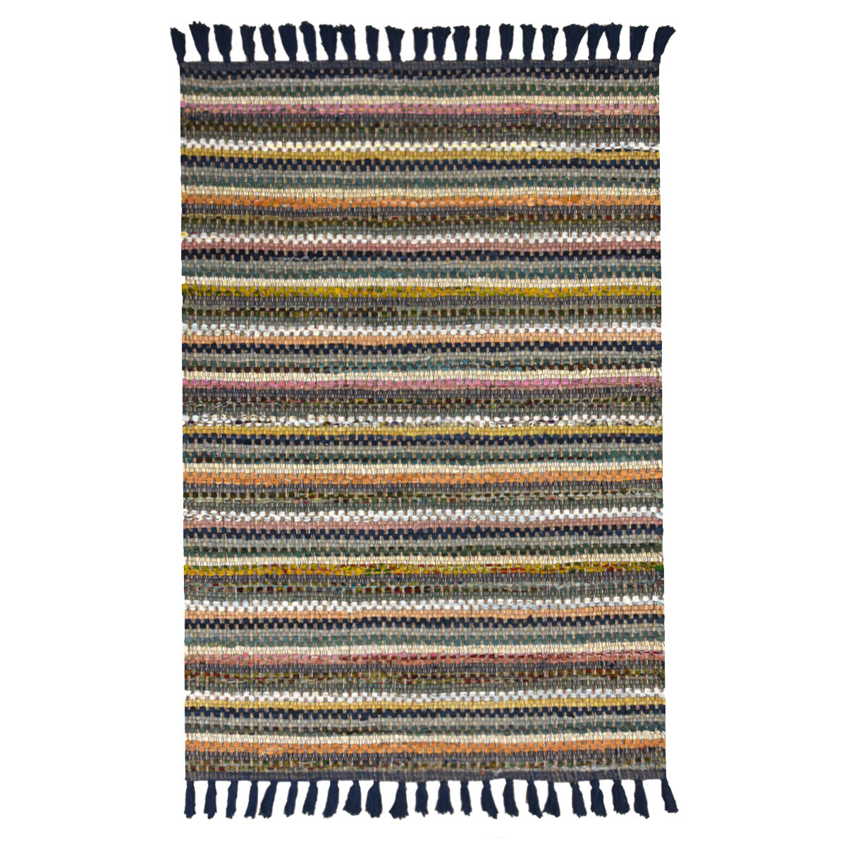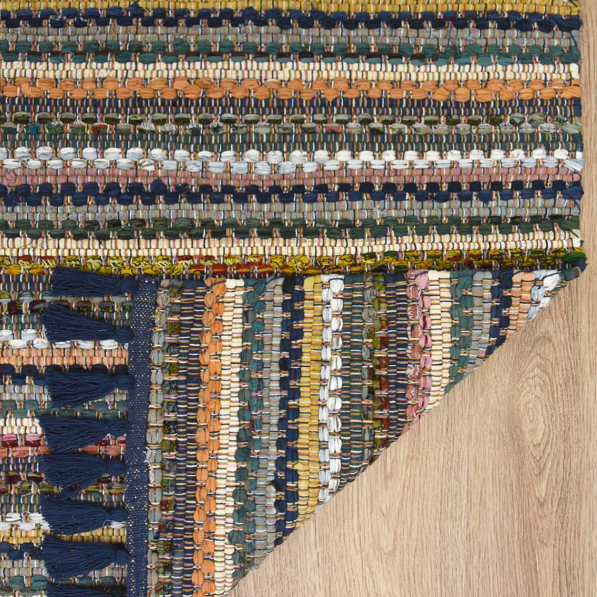 שטיח פסים יפיפה הנארג בעבודת יד מבדי כותנה ממוחזרים ההופכים אותו לשטיח בר-קיימא, רך ונעים למגע. השטיח רחיץ ומתאים לניקוי באמצעות שטיפה ידנית במים וסבון. מעוצב בפלטת צבעים ססגונית המשלבת גוונים שונים לצד כחול. צבעוניות השטיח היפיפייה מספקת מראה עשיר ומגוון ומאפשרת לשלבו לצד מגוון רהיטים ובאזורים שונים בבית. בעל סיומת פרנזים המקנה לשטיח מראה שיקי במיוחד.
