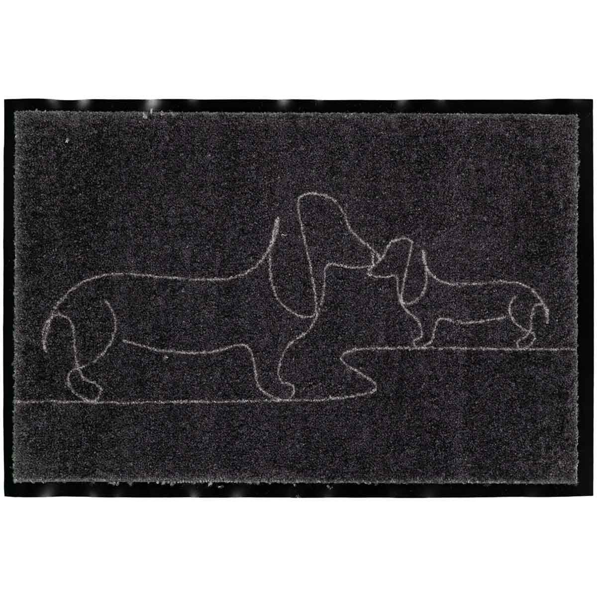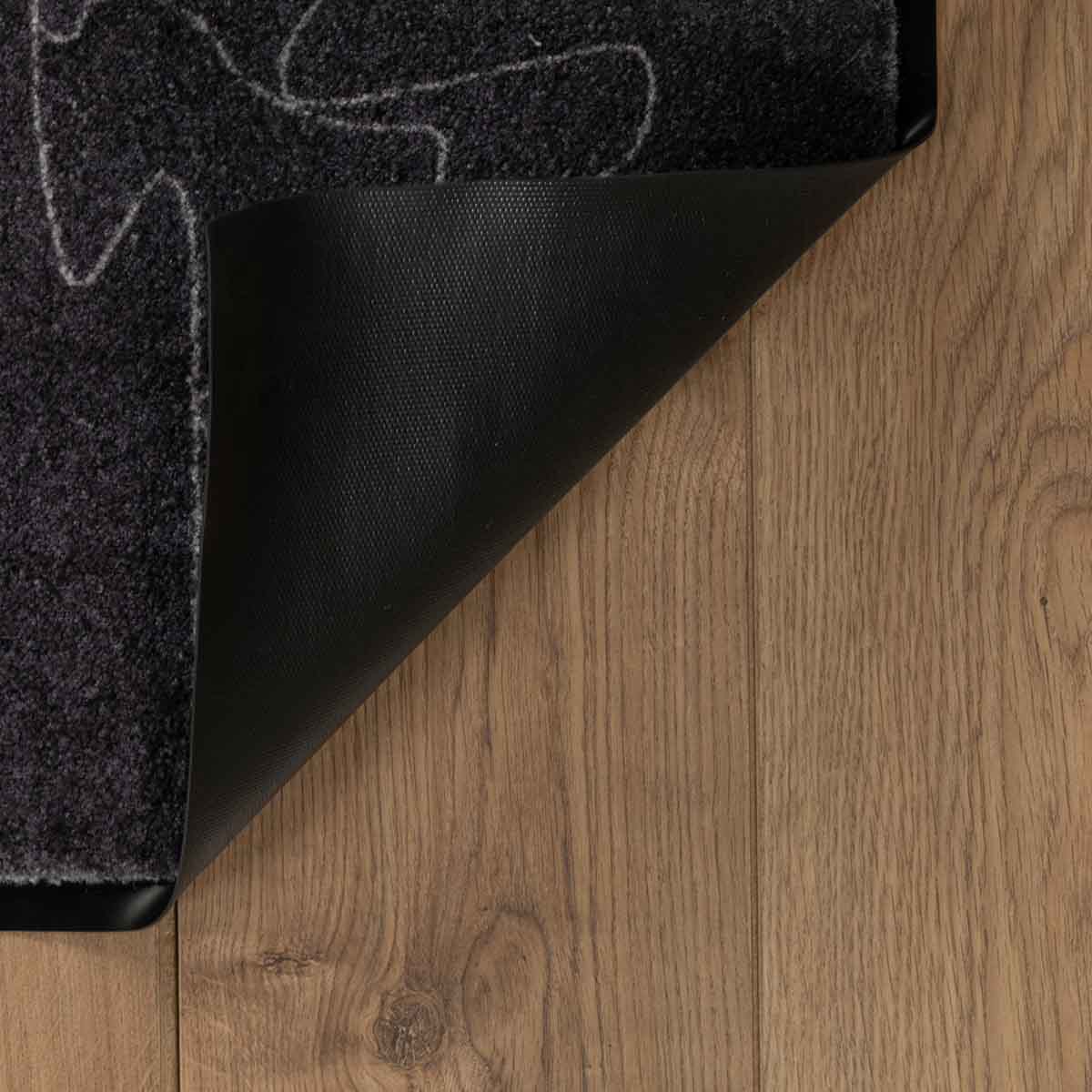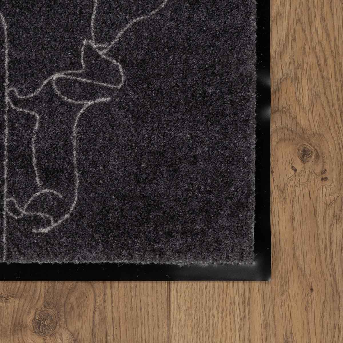שטיח כניסה שחור עם איור עדין של כלבים בקו לבן מינימליסטי. השילוב בין הפלטה הניטרלית לאיור המאויר ביד אחת יוצר מראה אמנותי, מקורי ומלא אופי.