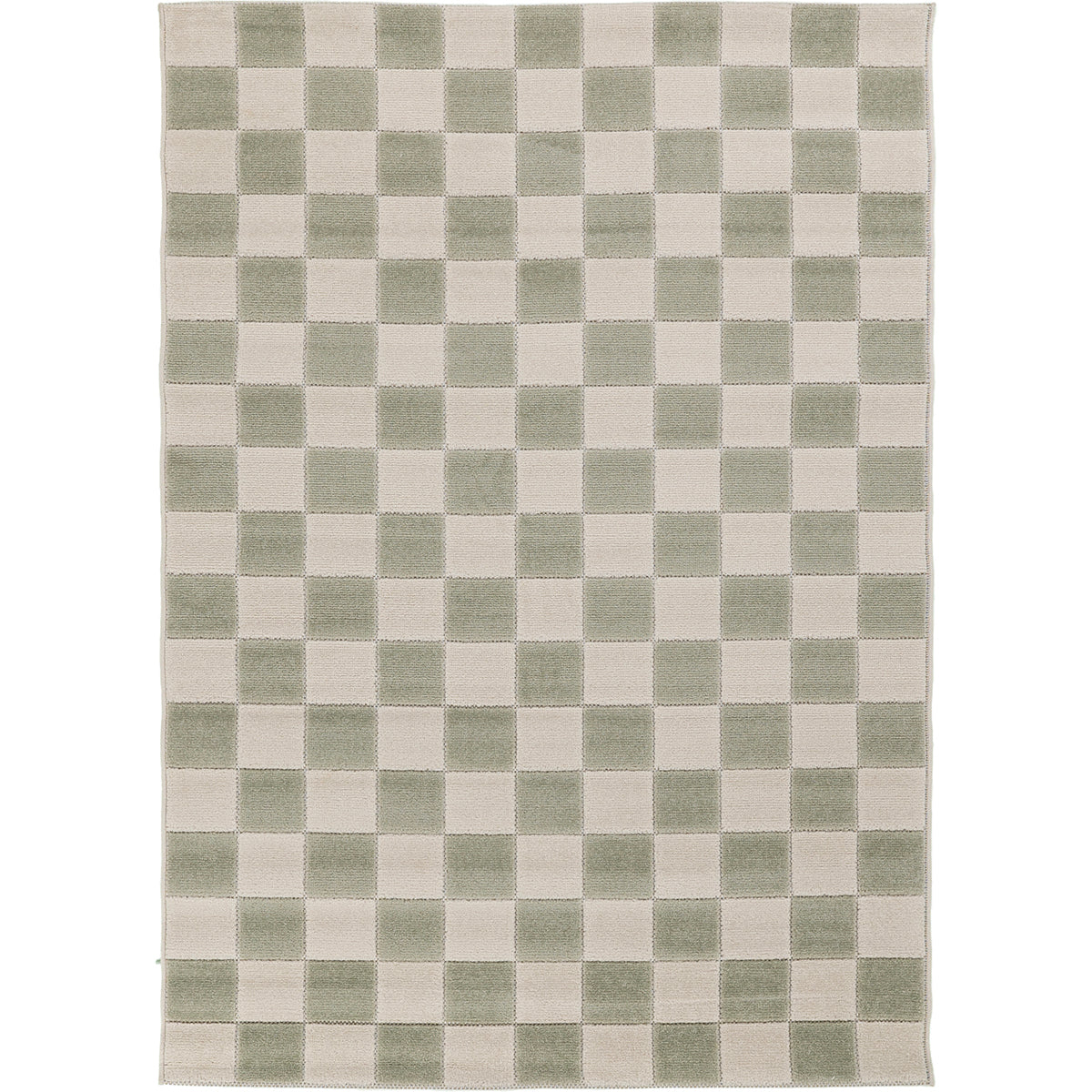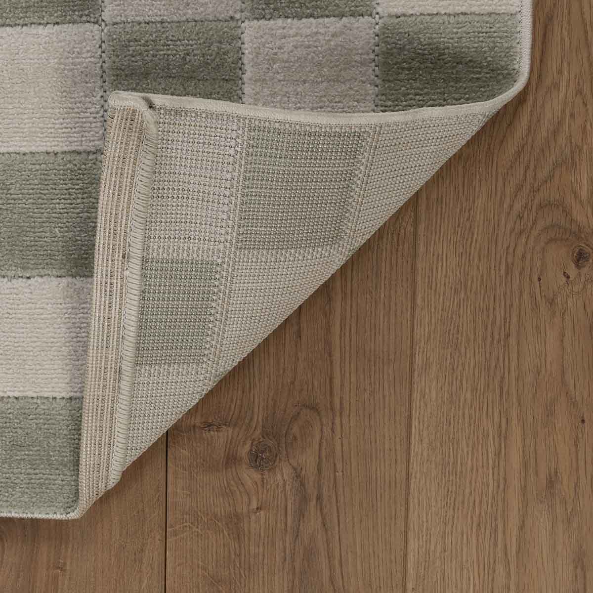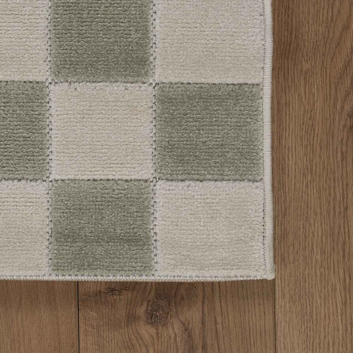 שטיח מודרני בעבודת מכונה, עשוי פוליפרופילן ופוליאסטר בגובה סיבים אחיד. מעוצב בדוגמת משבצות בגווני קרם וירוק בהיר, שמתקבלת מאריגה מדוייקת.