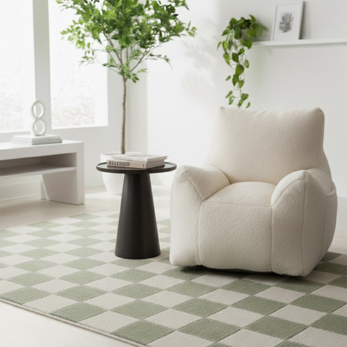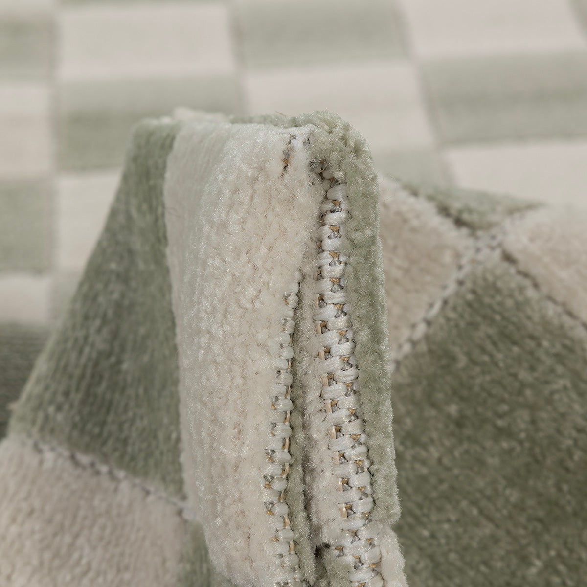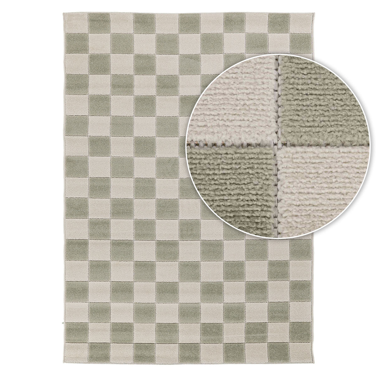 שטיח מודרני בעבודת מכונה, עשוי פוליפרופילן ופוליאסטר בגובה סיבים אחיד. מעוצב בדוגמת משבצות בגווני קרם וירוק בהיר, שמתקבלת מאריגה מדוייקת.
