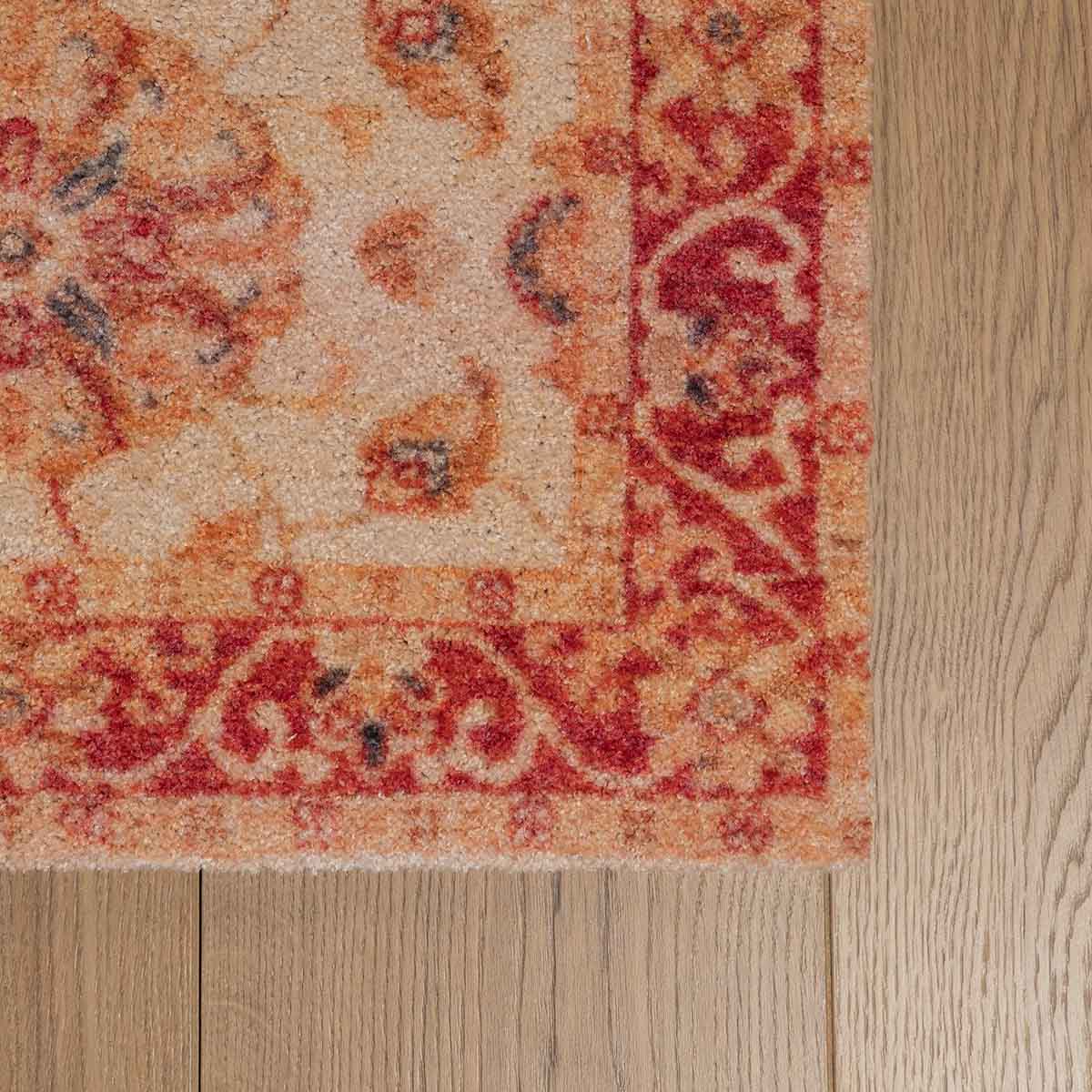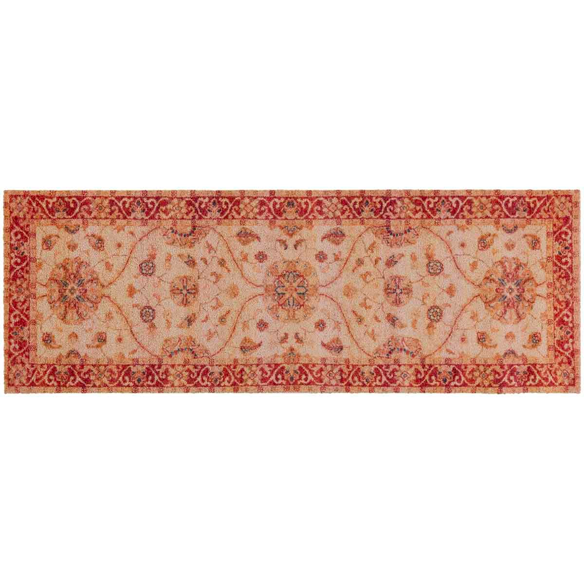 שטיח מטבח מעוצב בהשראת שטיחי זיגלר האייקוניים מהמאה ה־19, עם דוגמת פרחים סימטרית בגווני אדמה חמימים, אדום־זהוב, ורדרד וניואנסים עדינים נוספים.
